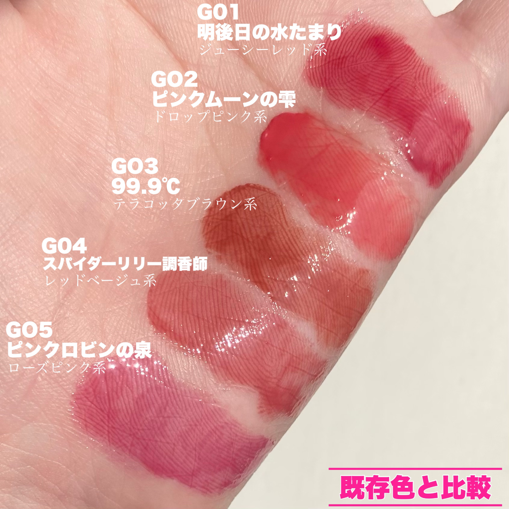 ひとぬりでとろけてツヤがあふれだす リップモンスターツヤバース。唇から蒸発する水分を活用してとろツヤジェル膜に変化する独自技術で、落ちにくい。 トロトロなのに唇に乗せると嫌なベタつきはなくてムラにもならずにスルスル伸び広がってかつしっかりカラー感も楽しめる濃密な発色♡ これは艶リップ好きさん試してみて欲しい! もし一色しか選べないとしたら私の推しはG02 ピンクムーンの雫♡
