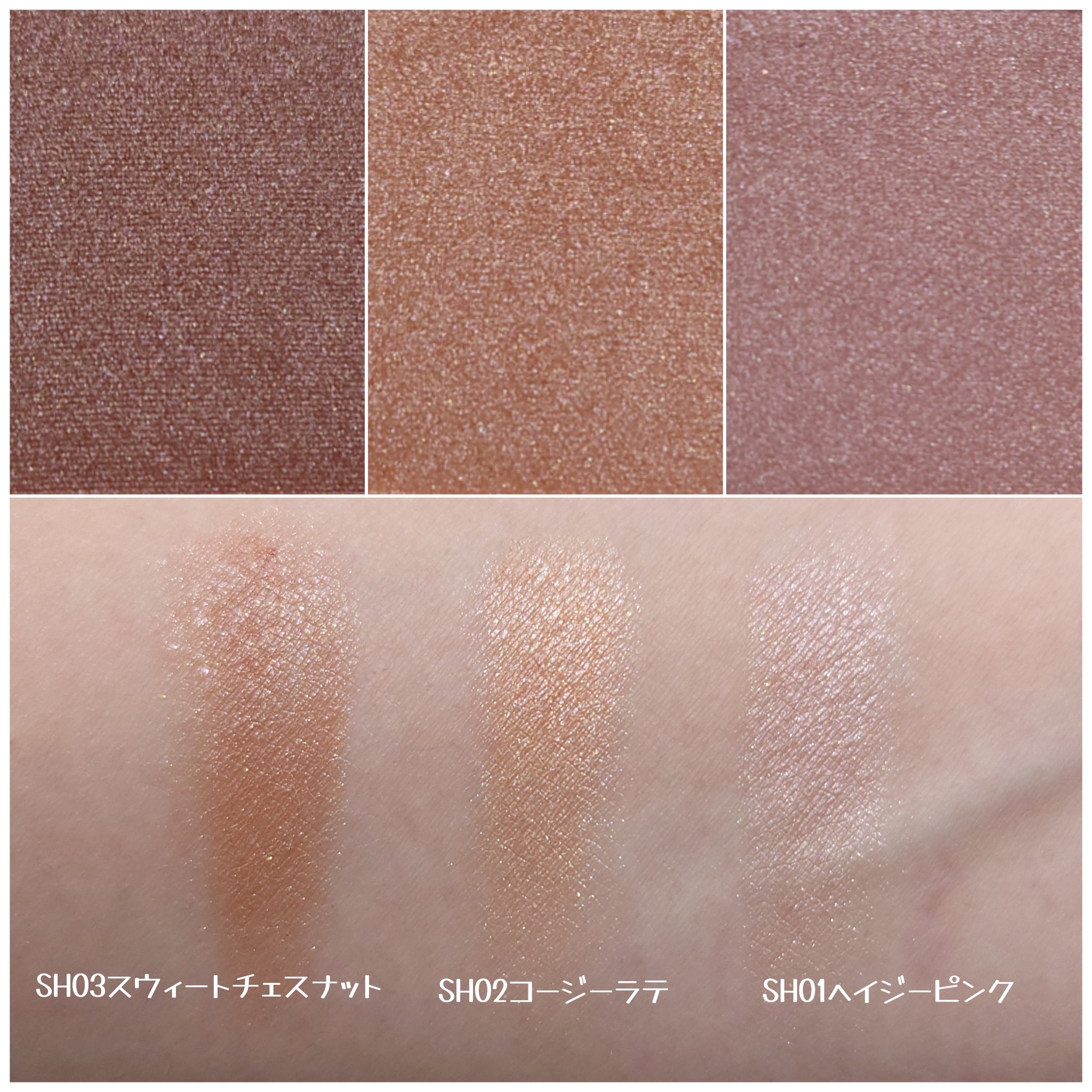 ひとひらは使いやすい色味のピンク 森の毛皮はカーキっぽい色味です✨ フローティングの方の冷凍ベリーは青ラメがスゴい❗ 光る角は色ものりつつラメ感もあるアイシャドウで ピンクやゴールドラメがキラキラしてます☺️ 銀の繭も色味はあまりなくラメが輝いてる感じで 黒目の上にのせたり涙袋にのせたりしたら 可愛いかなと思います✨ 多分、1番使いやすい色味だと思う🤔