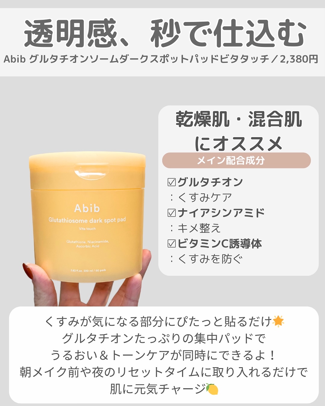 Abib グルタチオンソームダークスポットパッドビタタッチ | 2,380円 |