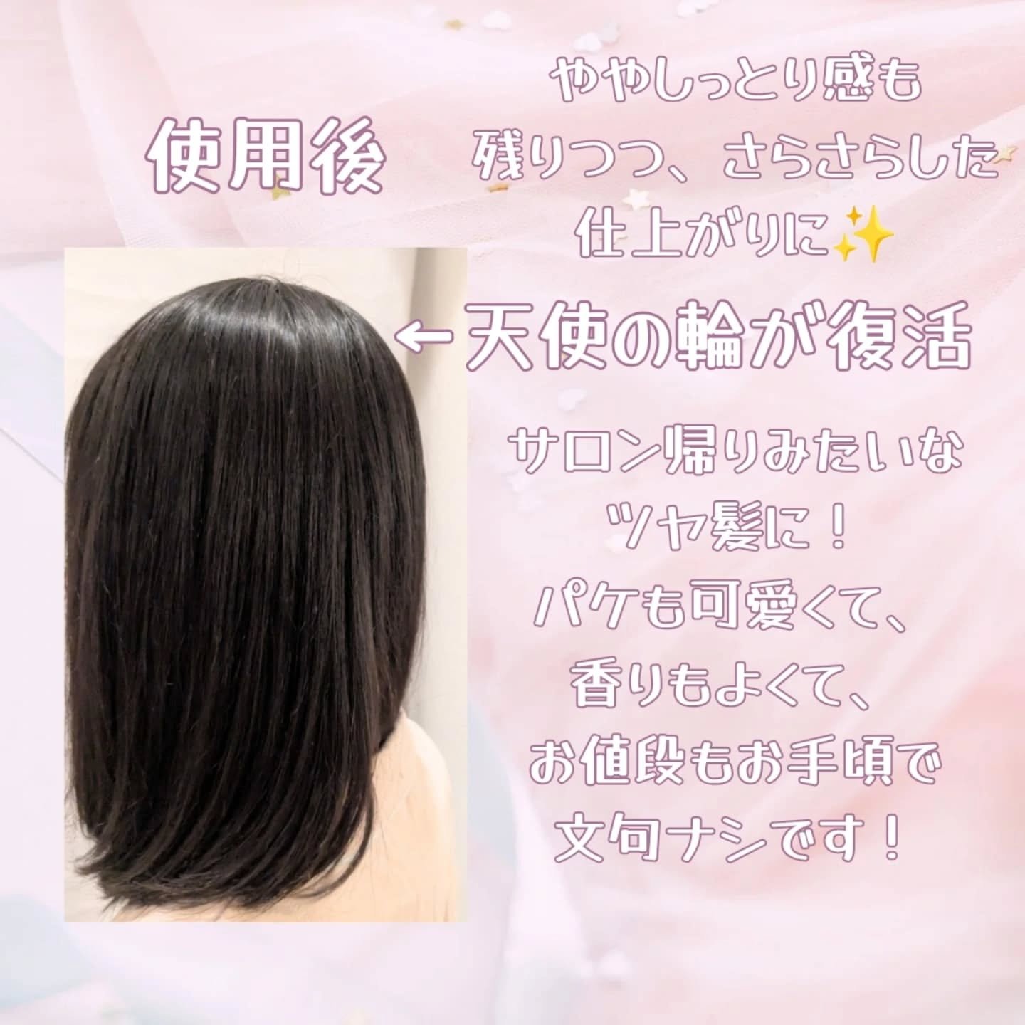 シャンプー、コンディショナーでこんなに変わるんですね✨ 天使の輪ができるなんて…すごい‼️良い情報ありがとうございます😺