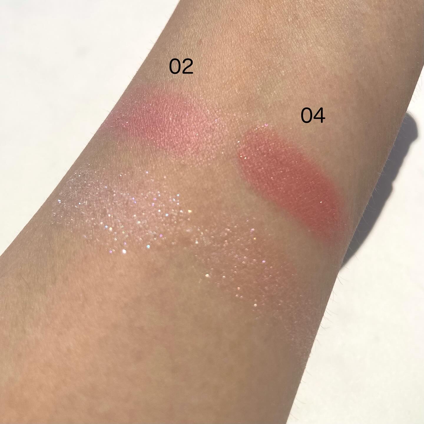 マットは肌に溶け込むような粉質でボソボソしません! シマーのしっとりした粉質も密着してくれて好き!!! 1番キラキラなのは右上のラメですね🍑💓でも粒が大きくないので、大人も使いやすいラメだと思います🥰 どの色使おうか迷うけど、どれ使っても本当可愛くて、自分が桃になったかのような🍑(笑)多幸感あふれるパレットです💘
