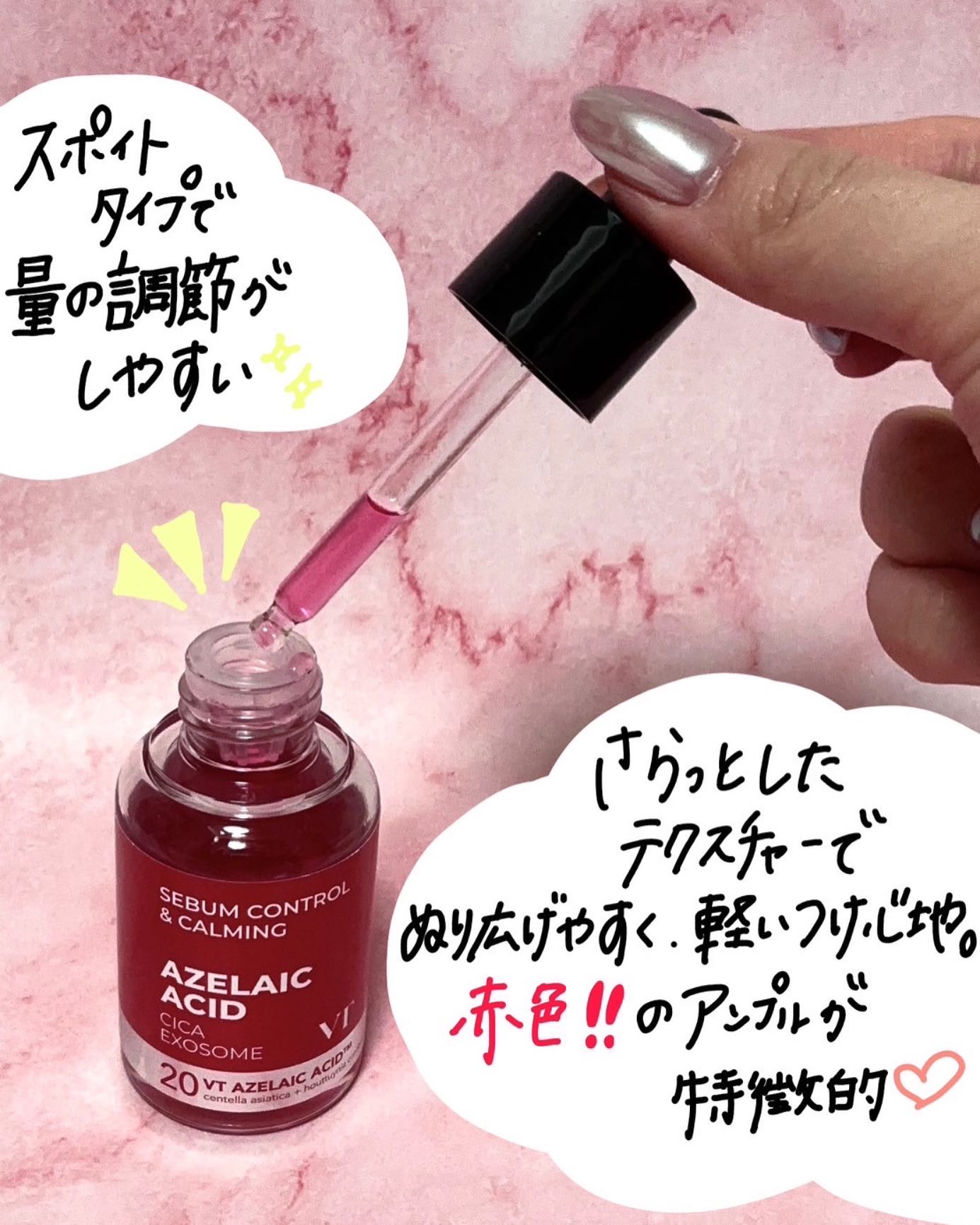 - ※リニューアルに伴いパッケージを変更しております。 肌悩み*1に合わせて主成分を選べるパーソナル美容液!A1カーミングアンプルのメイン成分は【アゼライン酸*2】。過度な油分、皮脂によるトラブルに悩む方は、さらっと軽めのテクスチャーでケアしてあげるのがキーポイント!VTのA1カーミングアンプルは肌のざらつき、油水分バランスを整え、さっぱりした保湿で肌悩み*1ケアにぴったり! *1 乾燥による *2 整肌成分