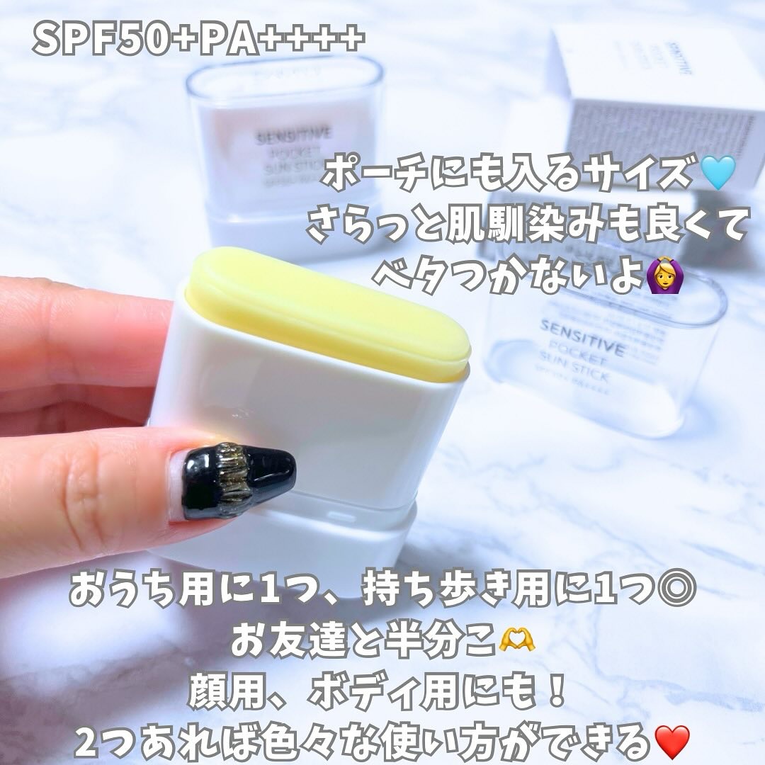 - ミニポケットサイズで、いつでもどこでも手軽に紫外線対策。 10gの小さくて軽いポケットミニサイズで、どこへでも携帯でき、ひと塗で簡単に使える手軽さをお届けします。 8種類のヒアルロン酸(保湿成分)を配合し、うるおいをプラス。 さらに多孔質パウダーを含むことで、何度塗り直してもテカらず、さらっと仕上がります。 SPF50+、PA++++の高い紫外線カット効果を持つポケットサンスティックです。