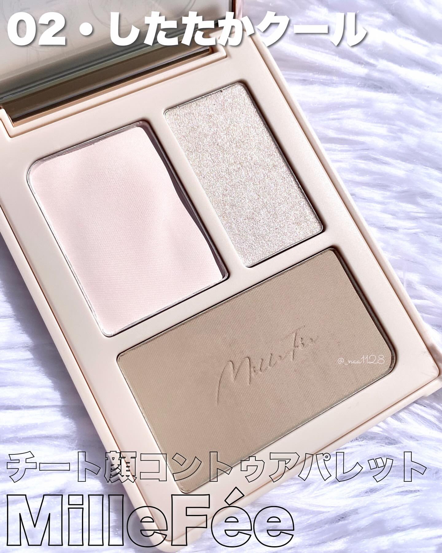 🏷:MilleFéeチート顔コントゥアパレット02したたかクール全2色展開¥20903つの質感×パーソナルカラーで誰でも簡単、立体顔に✨️マットハイライト、パールハイライト、シェーディングが1つのパレットに入っていてこれ1つでチート級の立体顔...