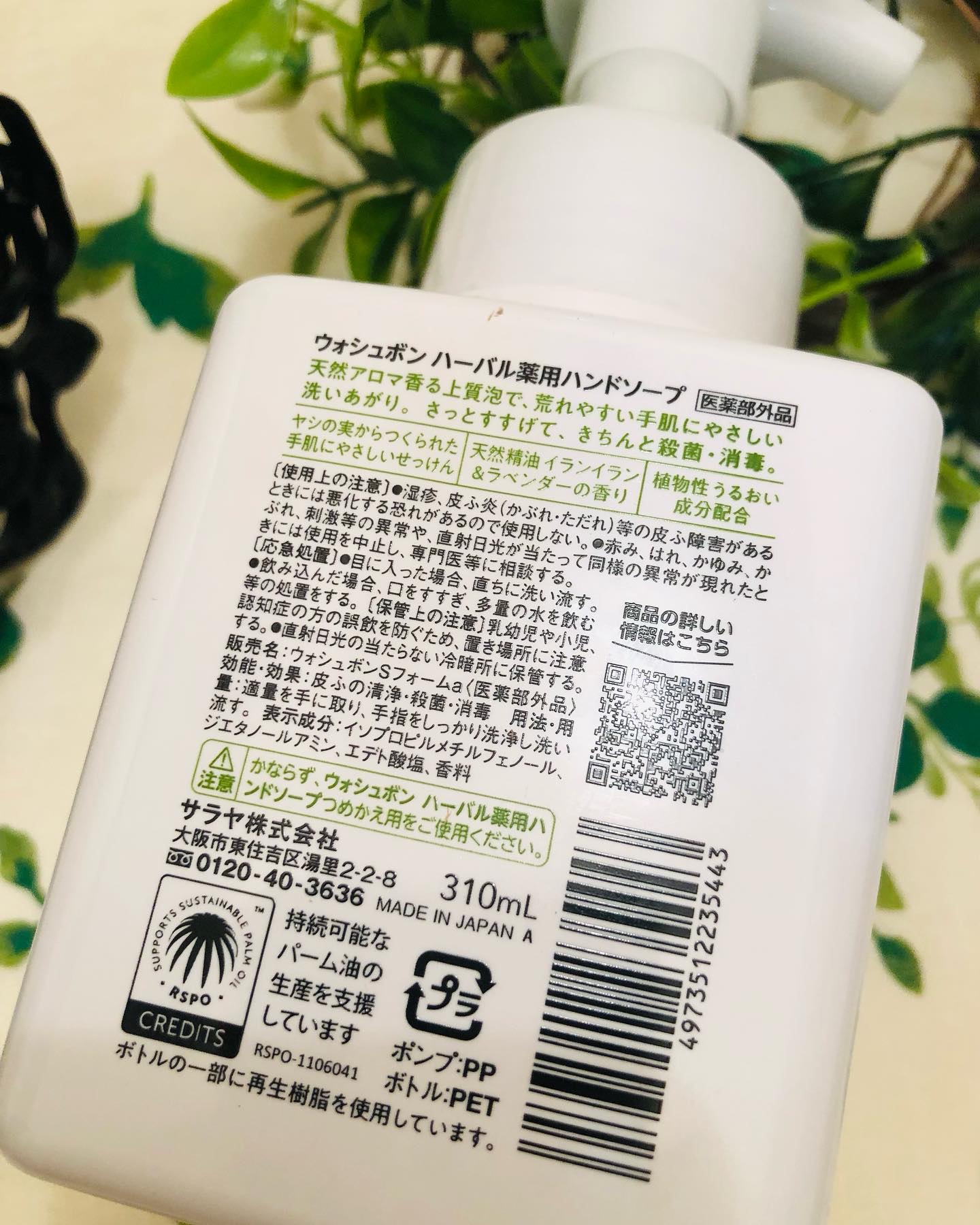 ウォシュボン ハーバル薬用ハンドソープは医薬部外品の泡ハンドソープ。殺菌・消毒効果があり、ヤシの実生まれの植物性洗浄成分を使用しているので手肌に優しく洗う事ができます。 泡で出てくるタイプのハンドソープで真っ白なふわふわな泡で洗う事が出来ます。泡切れも良く、いつまでもヌルヌルっとしないのが子どもにも使いやすいよう。 イランイラン&ラベンダーの天然精油100%がとっても心地よい香りで何だか幸せな気分で手を洗う事ができます。