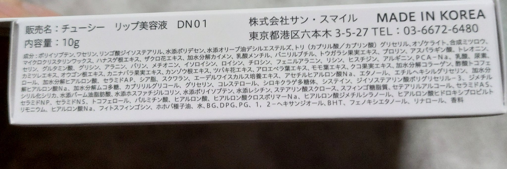 - <デイニードルリップ> ポリイソブテン、ワセリン、リンゴ酸ジイソステアリル、水添ポリデセン、水添オリーブ油デシルエステルズ、トリ(カプリル酸/カプリン 酸)グリセリル、オゾケライト、合成ミツロウ、マイクロクリスタリンワックス、ハナスゲ根エキス、ザクロ花エキス、加水分解カイメン、乳酸メ ンチル、バニリルブチル、トウガラシ果実エキス、プロリン、アスパラギン酸、トレオニン、セリン、グルタミン酸、グリシン、アラニン、バリン、メ チオニン、イソロイシン、ロイシン、チロシン、フェニルアラニン、リシン、ヒスチジン、アルギニン、PCA-Na、乳酸、尿素、カミツレエキス、オ ウゴン根エキス、カニナバラ果実エキス、カンゾウ根エキス、ツバキ花エキス、アロエベラ葉エキス、モモ葉エキス、クコ果実エキス、加水分 解コラーゲン、酢酸トコフェロール、加水分解ヒアルロン酸、セラミドAP、シア脂、スクワラン、エーデルワイスカルス培養エキス、アセチル ヒアルロン酸Na、エタノール、エチルヘキシルグリセリン、加水分解ヒアルロン酸Na、加水分解ムコ多糖、カプリリルグリコール、グリセリ ン、コレステロール、シロキクラゲ多糖体、システイン、ジイソステアリン酸ポリグリセリル-3、ジメチルシリル化シリカ、水添パーム油脂肪 酸、水添ホスファチジルコリン、水添ポリイソブテン、水添レシチン、ステアリン酸スクロース、スフィンゴ糖脂質、セテアリルアルコール、セ ラミドAS、セラミドNP、セラミドNS、トコフェロール、パルミチン酸、ヒアルロン酸、ヒアルロン酸クロスポリマーNa、ヒアルロン酸ジメチ ルシラノール、ヒアルロン酸ヒドロキシプロピルトリモニウム、ヒアルロン酸Na、フィトスフィンゴシン、ホホバ種子油、水、BG、DPG、PG、1,2-ヘキサンジオール、BHT、フェノキシエタノール、リナロール、香料