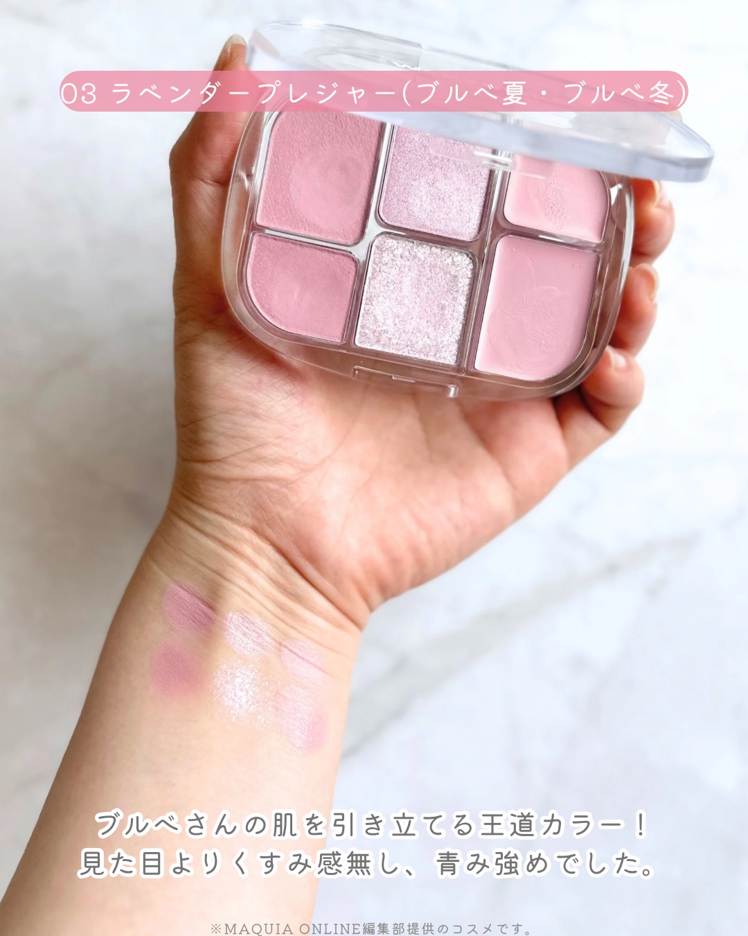 青み寄りのスモーキーカラーが並んでいます。 くすみのカラーが得意なゾーンの人ですが、ラメ、パールのカラーをしっかりと仕込み、くすみを飛ばすとブルベ冬の方でも使いやすいです♡ こういう色を持っているとオフィスメイクをするときに役に立つのでおすすめですよ!