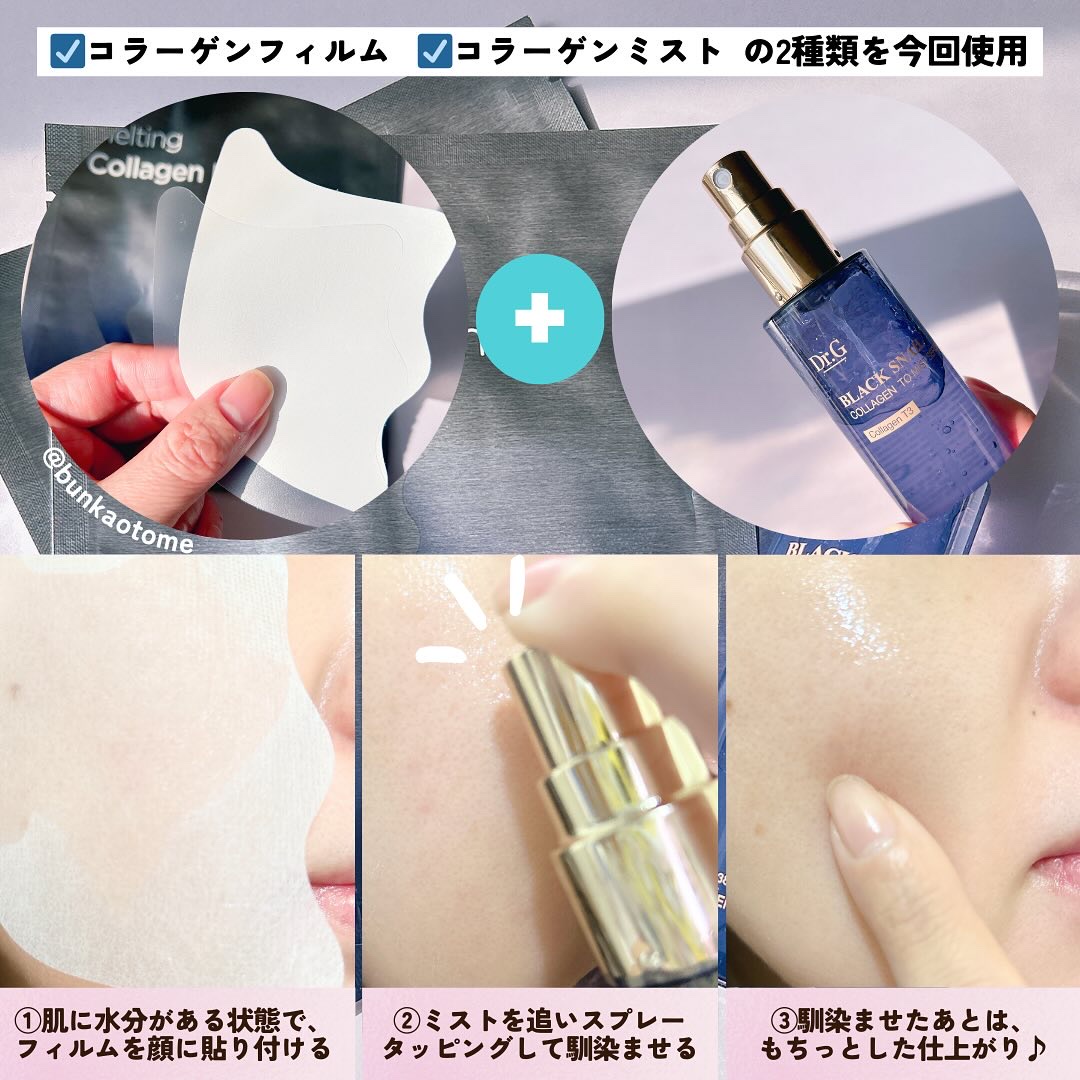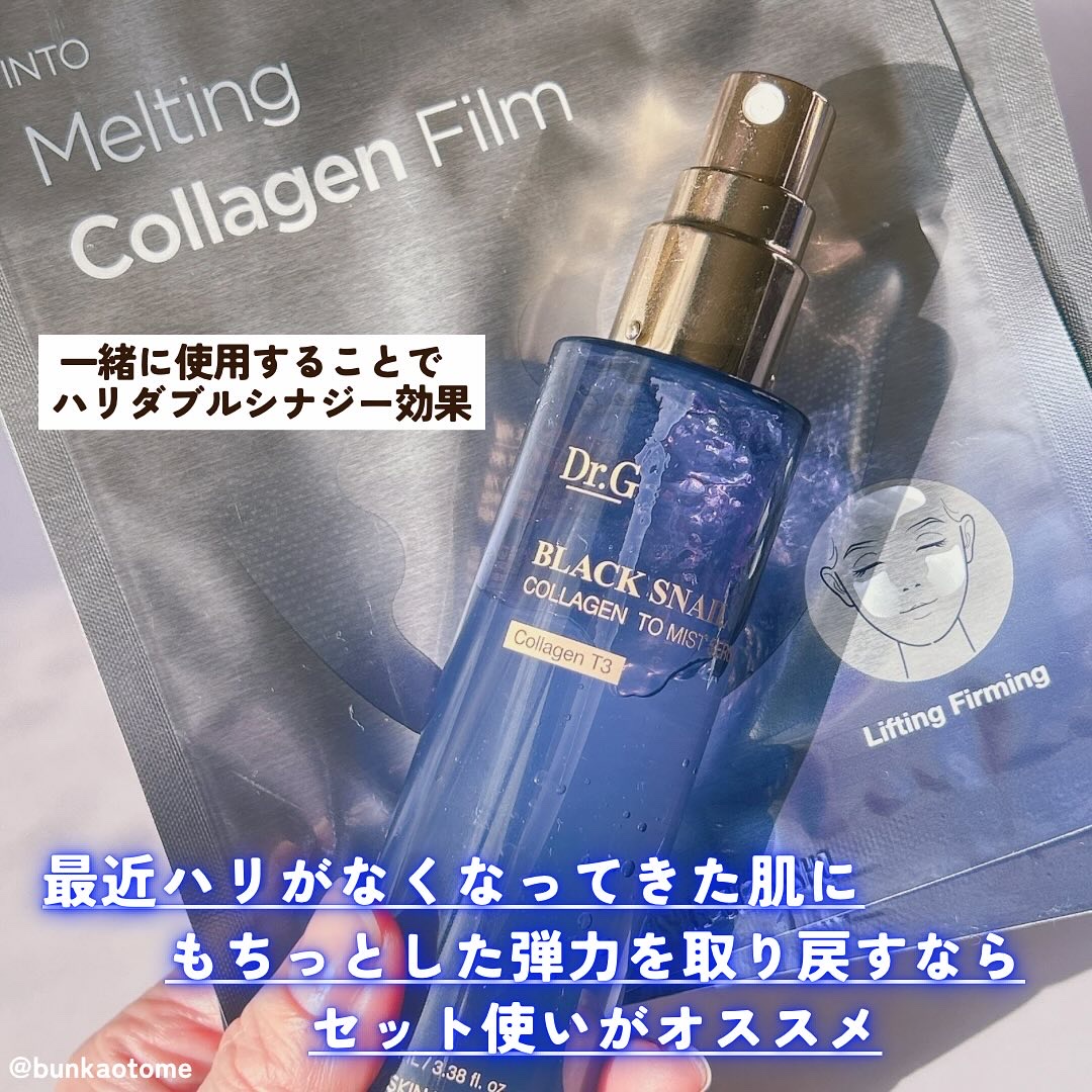 ブラックスネイル配合で、肌にしっかり栄養を与えてくれるよ!ゼリー状なのに吹きかけるときめ細かいミストに😳✨ 溶けてえるコラーゲンライルム😳✨ フィルム自体がコラーゲンのかたまりになっていて、洗顔後RTXセラムを塗った後に、コラーゲンフィルムを肌に貼り、ミストセラムをふりかけて使用するよ! ミストを吹きかけるとすーっとお肌に溶け込んで不思議な感覚✨ 手のひらに吸い付くようなもっちり感でハリも感じられて◎👌✨