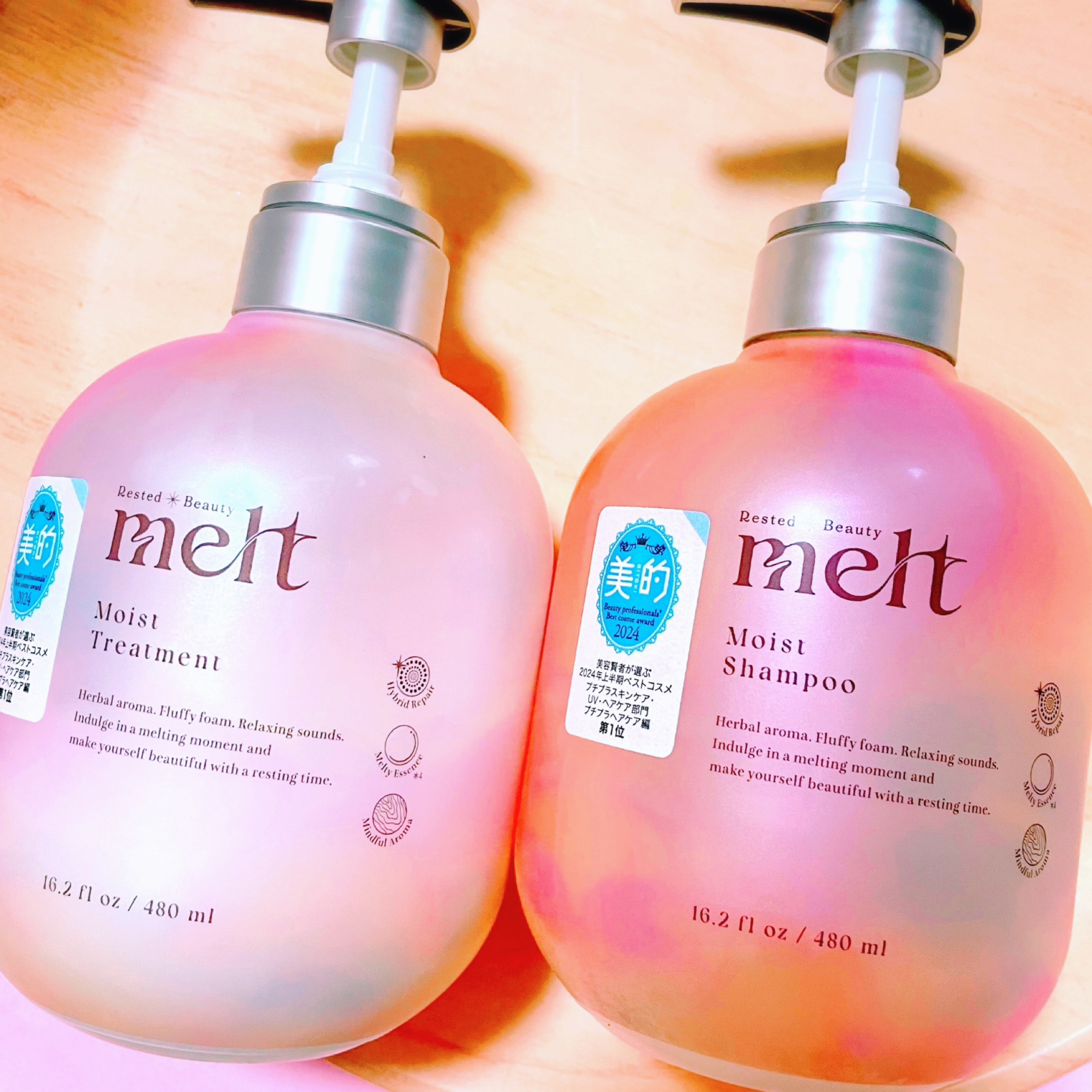 #PR#meltmeltモイストシャンプー/モイストトリートメントころんとした丸みのあるボトルのmeltのヘアケア✨可愛いカラーで映えるけど場所は取るかな…髪表面と内側を同時に補修する「ハイブリッドリペア処方」を採用し、やわらかさと輝きを引き...