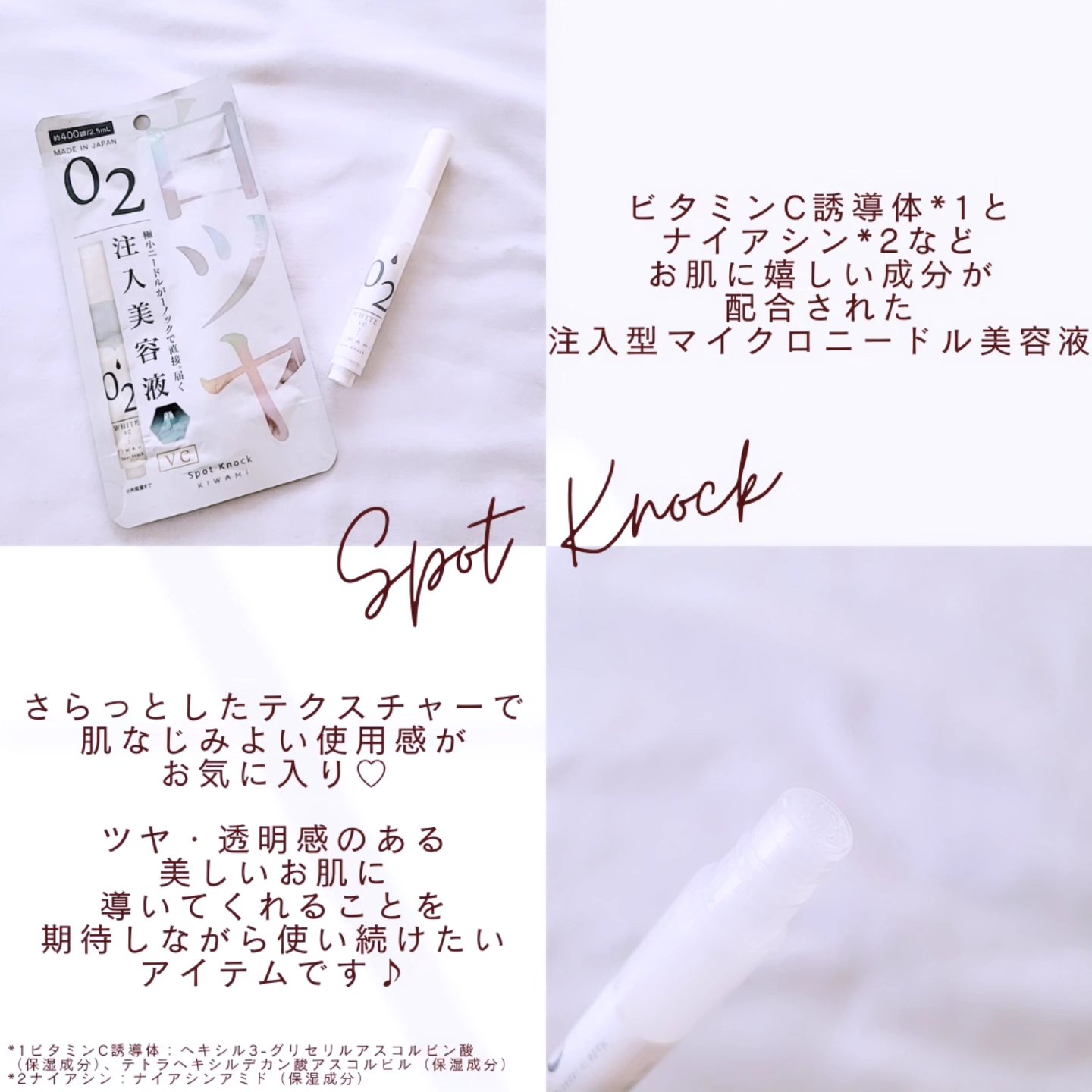 - ■ビタミンC誘導体*2×ナイアシン*3をノック式注入器でお肌に打ち込む新発想 ビタミンC誘導体*2とナイアシン*3を注入するスキンケアで、200μmの極小ニードルでダイレクト注入*1。成分を直接届ける*1ニードル型美容となっています。 *1角質層まで *2ビタミンC誘導体:ヘキシル3-グリセリルアスコルビン酸(保湿成分)、 テトラヘキシルデカン酸アスコルビル(保湿成分) *3ナイアシン:ナイアシンアミド(保湿成分) ■お悩みスポットにピンポイントに届ける 「刺さって残す」という技術。 角質層に成分が浸透するための経路を作成し、注入器を抜くことでうるおい成分を閉じ込めます。 刺して角質層まで届ける美容液! ■トラブル肌を保護し、ケアしつつ整えていく複合成分を配合 トラブル肌を保護し、ケアしつつ整えていく複合成分を配合。 〈成分〉①グリチルリチン酸2K:肌をすこやかに保つ成分 ②ヒアルロン酸Na:人間の肌に存在する天然保湿成分(NMF)の一種 ③スクワラン(保湿成分):ヒトの皮膚を覆っている皮表脂質の構成成分 ④グレープフルーツ種子エキス:果実の種子から抽出・精製された植物由来の整肌成分