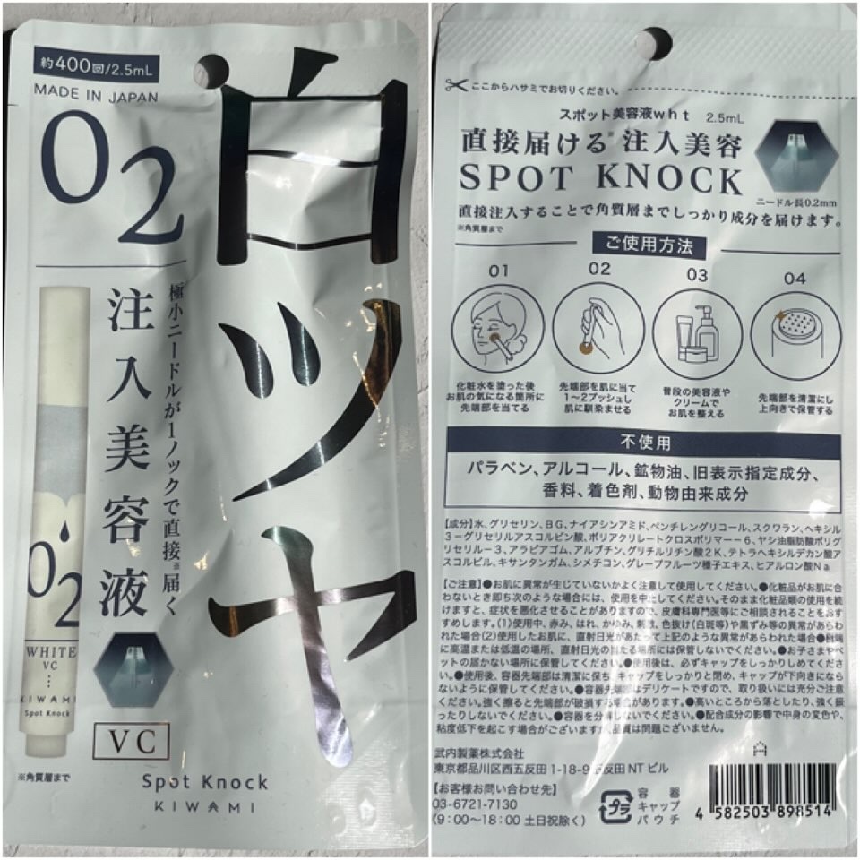 - ■ビタミンC誘導体*2×ナイアシン*3をノック式注入器でお肌に打ち込む新発想 ビタミンC誘導体*2とナイアシン*3を注入するスキンケアで、200μmの極小ニードルでダイレクト注入*1。成分を直接届ける*1ニードル型美容となっています。 *1角質層まで *2ビタミンC誘導体:ヘキシル3-グリセリルアスコルビン酸(保湿成分)、 テトラヘキシルデカン酸アスコルビル(保湿成分) *3ナイアシン:ナイアシンアミド(保湿成分) ■お悩みスポットにピンポイントに届ける 「刺さって残す」という技術。 角質層に成分が浸透するための経路を作成し、注入器を抜くことでうるおい成分を閉じ込めます。 刺して角質層まで届ける美容液! ■トラブル肌を保護し、ケアしつつ整えていく複合成分を配合 トラブル肌を保護し、ケアしつつ整えていく複合成分を配合。 〈成分〉①グリチルリチン酸2K:肌をすこやかに保つ成分 ②ヒアルロン酸Na:人間の肌に存在する天然保湿成分(NMF)の一種 ③スクワラン(保湿成分):ヒトの皮膚を覆っている皮表脂質の構成成分 ④グレープフルーツ種子エキス:果実の種子から抽出・精製された植物由来の整肌成分