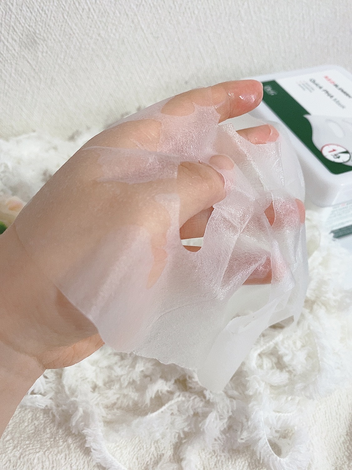核心成分であるPHAで、肌の不要な角質をケアして、無駄な角質のない陶器肌、朝の使用で化粧崩れしない土台を使ってくれるシートマスクになっております✨ 肌を鎮静させてくれるCICA成分が5種入っており、外部からの刺激による肌荒れや赤みを瞬時にぐっと抑えてくれるそうです。 薄手のシートで肌にピタっと密着してくれます。こちらはたった1分で鎮静水分ケアができます。