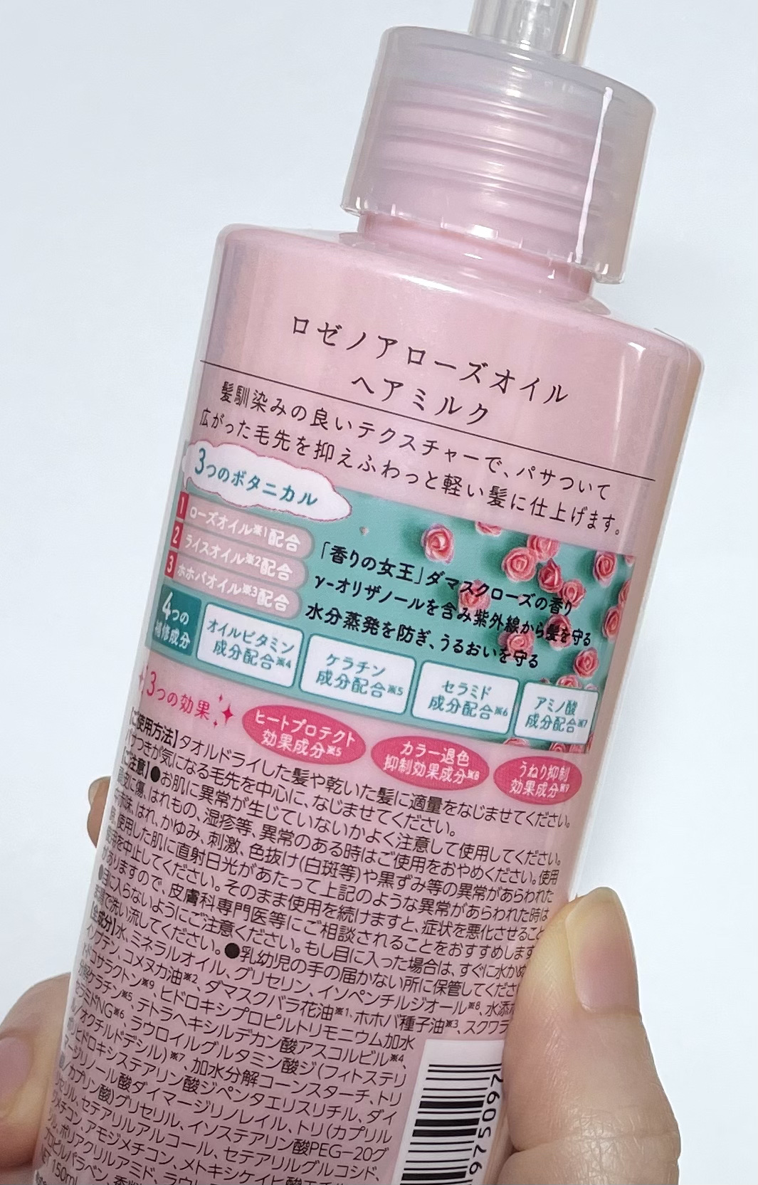 黒ばら本舗ロゼノアローズオイルヘアミルク 3つのボタニカル•ローズオイル配合•ライスオイル配合•ホホバオイル配合4つの補修成分•オイルビタミン成分配合•ケラチン成分配合•セラミド成分配合•アミノ酸成分配合3つの効果•ヒートプロテクト効果成分•...