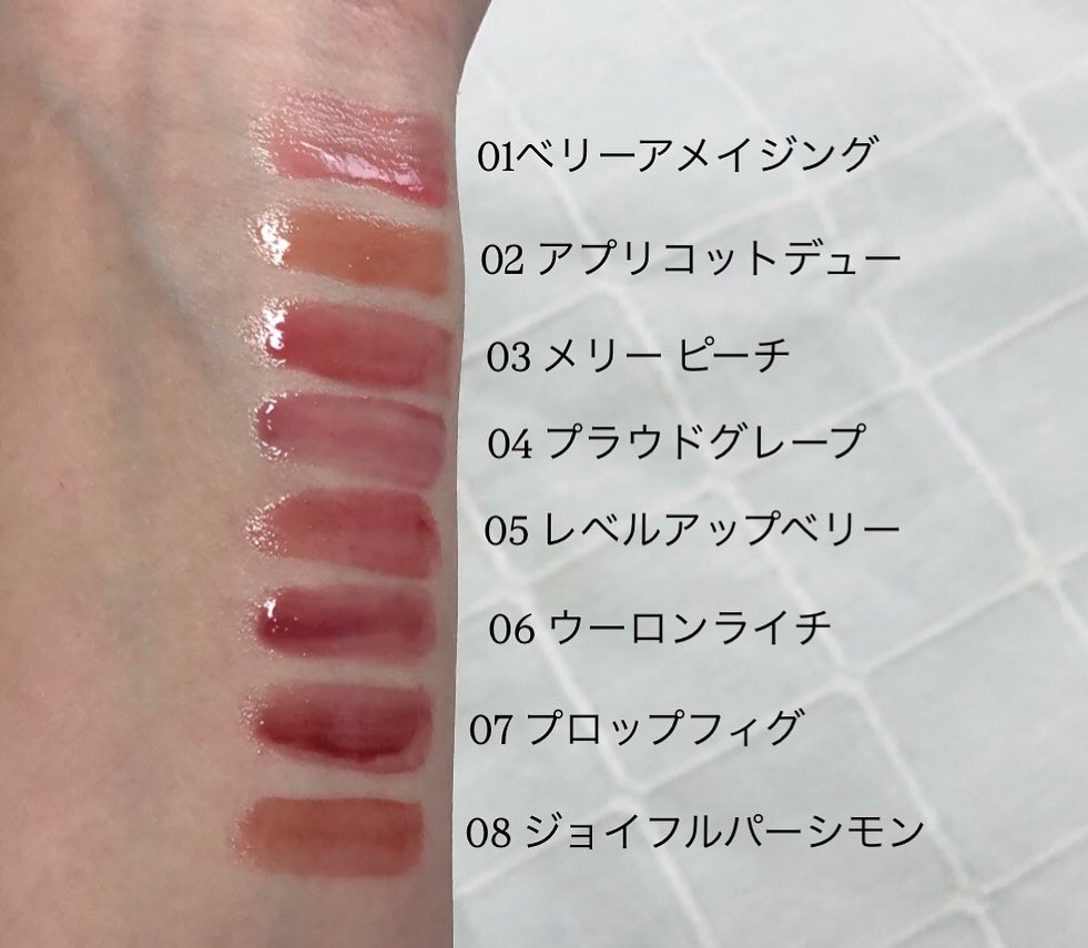 - <01 ベリーアメイジング> 水、デカイソステアリン酸ポリグリセリル-10、ビスジグリセリルポリアシルアジペート-2、ジフェニルジメチコン、フェニルトリメチコン、リンゴ酸ジイソステアリル、水添ポリイソブテン、ジグリセリン、ポリソルベート60、BG、セチルPEG/PPG-10/1ジメチコン、1,2-ヘキサンジオール、ペンチレングリコール、セテアレス-20、(アクリル酸ヒドロキシエチル/アクリロイルジメチルタウリンNa)コポリマー、スクワラン、フェノキシエタノール、エチルヘキシルグリセリン、香料、黄5、酸化チタン、イソステアリン酸ソルビタン、赤104(1)、赤227、水酸化Al、ポリアクリル酸アンモニウム、トコフェロール <02 アプリコットデュー> 水、デカイソステアリン酸ポリグリセリル-10、ビスジグリセリルポリアシルアジペート-2、ジフェニルジメチコン、フェニルトリメチコン、リンゴ酸ジイソステアリル、水添ポリイソブテン、ジグリセリン、ポリソルベート60、BG、セチルPEG/PPG-10/1ジメチコン、1,2-ヘキサンジオール、ペンチレングリコール、セテアレス-20、(アクリル酸ヒドロキシエチル/アクリロイルジメチルタウリンNa)コポリマー、スクワラン、フェノキシエタノール、酸化チタン、エチルヘキシルグリセリン、香料、黄4、黄5、イソステアリン酸ソルビタン、赤227、赤104(1)、水酸化Al、ポリアクリル酸アンモニウム、青1、トコフェロール <03 メリーピーチ> 水、デカイソステアリン酸ポリグリセリル-10、ビスジグリセリルポリアシルアジペート-2、ジフェニルジメチコン、フェニルトリメチコン、リンゴ酸ジイソステアリル、水添ポリイソブテン、ジグリセリン、ポリソルベート60、BG、セチルPEG/PPG-10/1ジメチコン、1,2-ヘキサンジオール、ペンチレングリコール、セテアレス-20、(アクリル酸ヒドロキシエチル/アクリロイルジメチルタウリンNa)コポリマー、スクワラン、フェノキシエタノール、酸化チタン、エチルヘキシルグリセリン、香料、黄4、赤227、イソステアリン酸ソルビタン、黄5、赤104(1)、水酸化Al、ポリアクリル酸アンモニウム、青1、トコフェロール <04 プラウドグレープ> 水、デカイソステアリン酸ポリグリセリル-10、ビスジグリセリルポリアシルアジペート-2、ジフェニルジメチコン、フェニルトリメチコン、リンゴ酸ジイソステアリル、水添ポリイソブテン、ジグリセリン、ポリソルベート60、BG、セチルPEG/PPG-10/1ジメチコン、1,2-ヘキサンジオール、ペンチレングリコール、セテアレス-20、(アクリル酸ヒドロキシエチル/アクリロイルジメチルタウリンNa)コポリマー、スクワラン、フェノキシエタノール、エチルヘキシルグリセリン、酸化チタン、香料、赤104(1)、黄4、イソステアリン酸ソルビタン、赤227、水酸化Al、ポリアクリル酸アンモニウム、青1、トコフェロール <05 レベルアップベリー> 水、デカイソステアリン酸ポリグリセリル-10、ビスジグリセリルポリアシルアジペート-2、ジフェニルジメチコン、フェニルトリメチコン、リンゴ酸ジイソステアリル、水添ポリイソブテン、ジグリセリン、ポリソルベート60、BG、セチルPEG/PPG-10/1ジメチコン、1,2-ヘキサンジオール、ペンチレングリコール、セテアレス-20、(アクリル酸ヒドロキシエチル/アクリロイルジメチルタウリンNa)コポリマー、スクワラン、フェノキシエタノール、エチルヘキシルグリセリン、香料、黄5、赤227、イソステアリン酸ソルビタン、青1、トコフェロール <06 ウーロンライチ> 水、デカイソステアリン酸ポリグリセリル-10、ビスジグリセリルポリアシルアジペート-2、ジフェニルジメチコン、フェニルトリメチコン、リンゴ酸ジイソステアリル、水添ポリイソブテン、ジグリセリン、ポリソルベート60、BG、セチルPEG/PPG-10/1ジメチコン、1,2-ヘキサンジオール、ペンチレングリコール、セテアレス-20、(アクリル酸ヒドロキシエチル/アクリロイルジメチルタウリンNa)コポリマー、スクワラン、フェノキシエタノール、酸化チタン、エチルヘキシルグリセリン、赤227、黄4、香料、イソステアリン酸ソルビタン、水酸化Al、ポリアクリル酸アンモニウム、青1、トコフェロール <07 プロップフィグ> 水、デカイソステアリン酸ポリグリセリル-10、ビスジグリセリルポリアシルアジペート-2、ジフェニルジメチコン、フェニルトリメチコン、リンゴ酸ジイソステアリル、水添ポリイソブテン、ジグリセリン、ポリソルベート60、BG、セチルPEG/PPG-10/1ジメチコン、1,2-ヘキサンジオール、ペンチレングリコール、セテアレス-20、(アクリル酸ヒドロキシエチル/アクリロイルジメチルタウリンNa)コポリマー、スクワラン、フェノキシエタノール、エチルヘキシルグリセリン、黄5、赤227、香料、イソステアリン酸ソルビタン、青1、トコフェロール <08 ジョイフルパーシモン> 水、デカイソステアリン酸ポリグリセリル-10、ビスジグリセリルポリアシルアジペート-2、ジフェニルジメチコン、フェニルトリメチコン、リンゴ酸ジイソステアリル、水添ポリイソブテン、ジグリセ