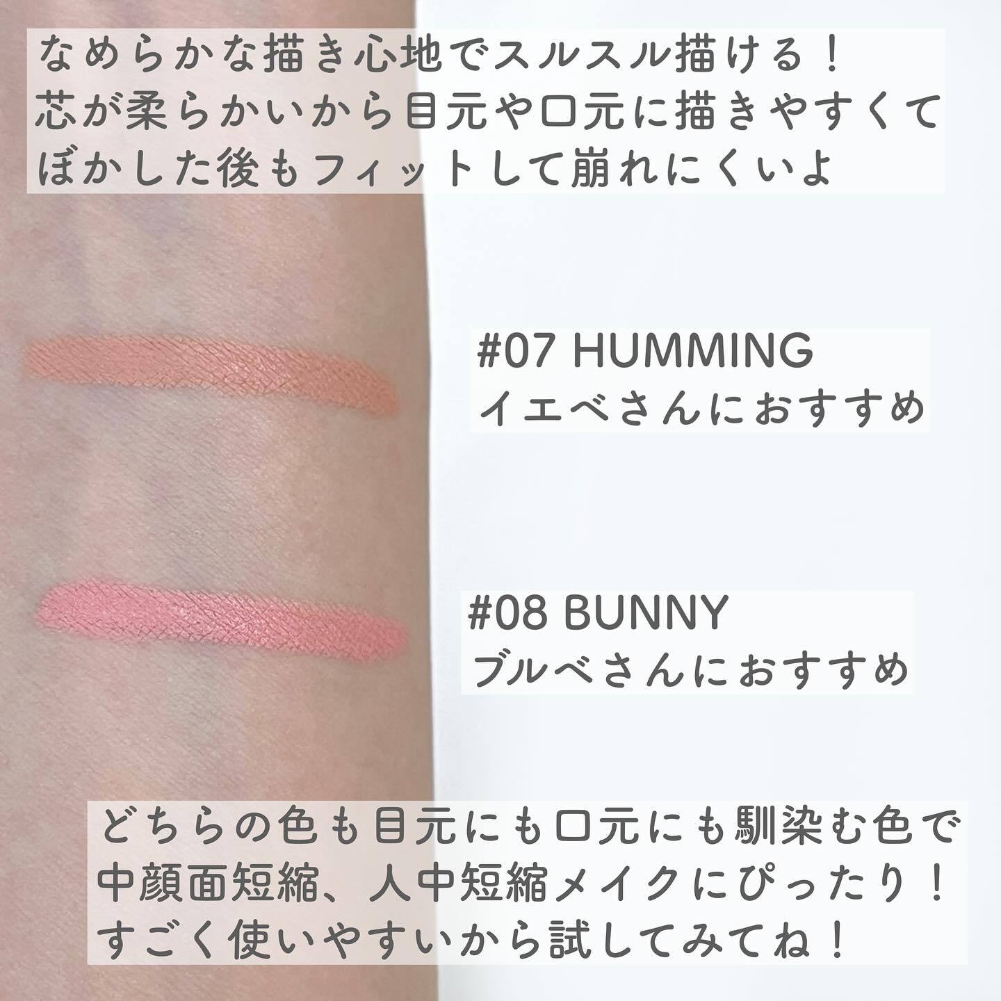 - <02 ファジー(Fuzzy)> トリメチルシロキシケイ酸、メチルトリメチコン、マイカ、合成ワックス、イソヘキサデカン、酸化鉄、グンジョウ、酸化チタン、セレシン、カルナウバロウ、トリイソステアリン酸ポリグリセリル-2、セテアリルアルコール、(アクリレーツ/アクリル酸ステアリル/メタクリル酸ジメチコン)コポリマー、オクチルドデカノール、マンガンバイオレット、メチコン、ジメチコン、水酸化Al、ジステアルジモニウムヘクトライト、炭酸プロピレン、カオリン <04 メロウ(Mellow) > トリメチルシロキシケイ酸、メチルトリメチコン、マイカ、合成ワックス、イソヘキサデカン、酸化チタン、酸化鉄、セレシン、カルナウバロウ、トリイソステアリン酸ポリグリセリル-2、セテアリルアルコール、(アクリレーツ/アクリル酸ステアリル/メタクリル酸ジメチコン)コポリマー、オクチルドデカノール、青1、水酸化Al、ジメチコン、メチコン、赤202、ジステアルジモニウムヘクトライト、リンゴ酸ジイソステアリル、炭酸プロピレン <05 ポッシュ(Posh)> トリメチルシロキシケイ酸、メチルトリメチコン、マイカ、合成ワックス、イソヘキサデカン、酸化鉄、酸化チタン、セレシン、カルナウバロウ、トリイソステアリン酸ポリグリセリル-2、(アクリレーツ/アクリル酸ステアリル/メタクリル酸ジメチコン)コポリマー、セテアリルアルコール、オクチルドデカノール、リンゴ酸ジイソステアリル、メチコン、ジメチコン、水酸化Al、ジステアルジモニウムヘクトライト、赤202、炭酸プロピレン、トリイソステアリン酸イソプロピルチタン <06 ダスク(Dusk)> トリメチルシロキシケイ酸、メチルトリメチコン、マイカ、合成ワックス、イソヘキサデカン、酸化鉄、酸化チタン、セレシン、カルナウバロウ、トリイソステアリン酸ポリグリセリル-2、セテアリルアルコール、(アクリレーツ/アクリル酸ステアリル/メタクリル酸ジメチコン)コポリマー、オクチルドデカノール、メチコン、ジメチコン、水酸化Al、ジステアルジモニウムヘクトライト、炭酸プロピレン <07 ハミング(Humming)> 酸化チタン、合成ワックス、エチルヘキサン酸アルキル(C12-15)、オクチルドデカノール、トリイソステアリン酸ポリグリセリル-2、イソヘキサデカン、セレシン、カルナウバロウ、(VP/ヘキサデセン)コポリマー、(アクリル酸アルキル/アクリル酸ステアリル/アクリル酸ジメチコン)コポリマー、シリカ、黄4、水酸化Al、セテアリルアルコール、ポリイソブテン、ジメチコン、トリイソステアリン酸イソプロピルチタン、青1、マイカ、メチコン <08 バニー(Bunny)> 酸化チタン、合成ワックス、エチルヘキサン酸アルキル(C12-15)、オクチルドデカノール、トリイソステアリン酸ポリグリセリル-2、イソヘキサデカン、セレシン、カルナウバロウ、(VP/ヘキサデセン)コポリマー、(アクリル酸アルキル/アクリル酸ステアリル/アクリル酸ジメチコン)コポリマー、シリカ、黄4、水酸化Al、セテアリルアルコール、ポリイソブテン、ジメチコン、トリイソステアリン酸イソプロピルチタン、青1、マイカ、メチコン <10 ライク(Like)> トリメチルシロキシケイ酸、メチルトリメチコン、マイカ、合成ワックス、イソヘキサデカン、酸化チタン、セレシン、黄4、カルナウバロウ、トリイソステアリン酸ポリグリセリル-2、酸化鉄、赤202、(アクリル酸アルキル/アクリル酸ステアリル/アクリル酸ジメチコン)コポリマー、セテアリルアルコール、オクチルドデカノール、水酸化Al、青1、メチコン、ジメチコン、ジステアルジモニウムヘクトライト、炭酸プロピレン