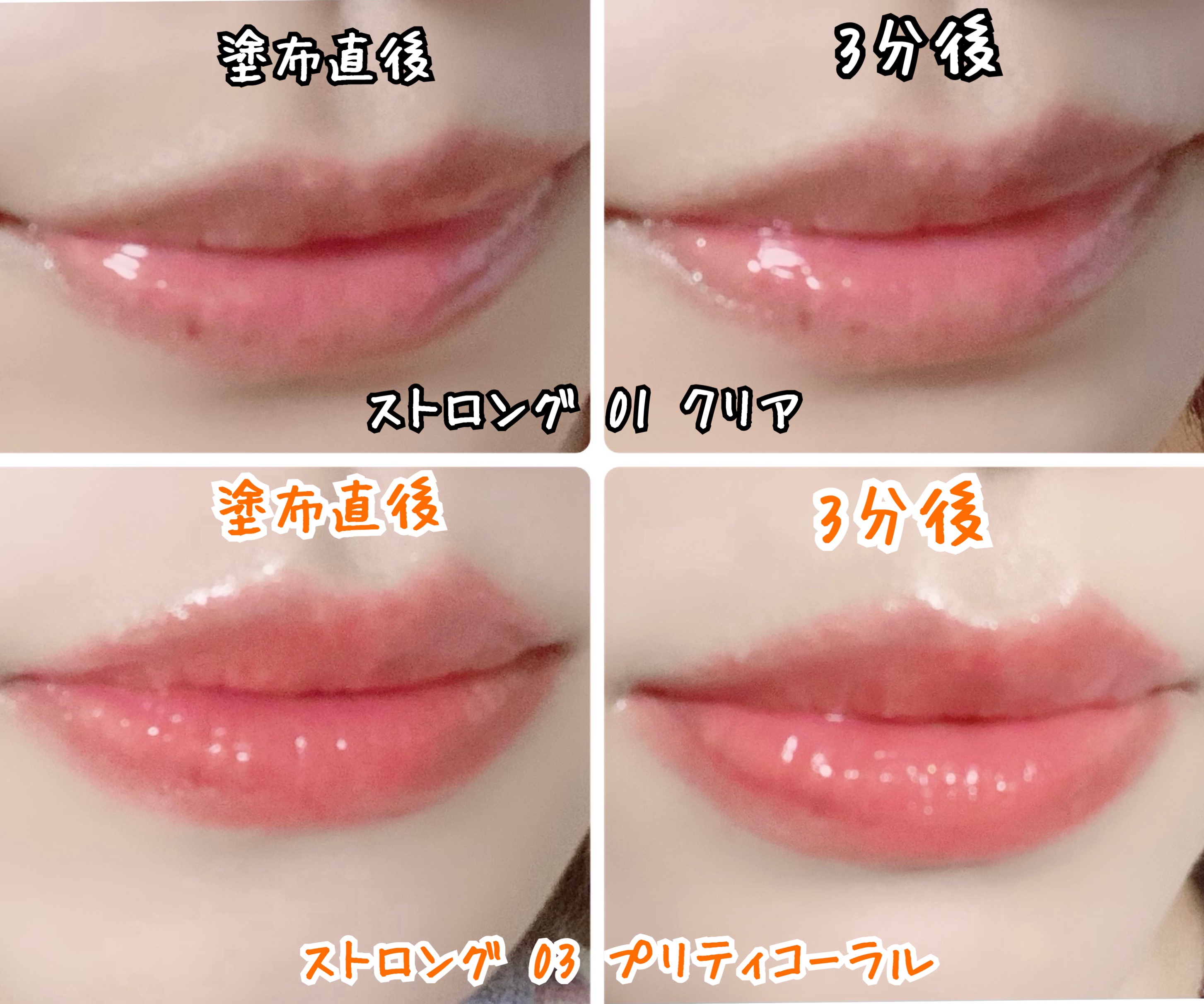 - <ベーシック 01 クリア> 水添ポリイソブテン、リンゴ酸ジイソステアリル、トリ(カプリル酸/カプリン酸)グリセリル、ヒドロキシステアリン酸エチルヘキシル、オクチルドデカノール、ジメチルシリル化シリカ、バニリルブチル、1,2-ヘキサンジオール、マイクロクリスタリンワックス、トリ脂肪酸(C10-18)グリセリル、乳酸メンチル、ヒアルロン酸Na、トリオレイン、香料、ジオレイン酸グリセリル <ストロング 01 クリア> 水添ポリイソブテン、リンゴ酸ジイソステアリル、トリ(カプリル酸/カプリン酸)グリセリル、ヒドロキシステアリン酸エチルヘキシル、オクチルドデカノール、バニリルブチル、ジメチルシリル化シリカ、1,2-ヘキサンジオール、マイクロクリスタリンワックス、乳酸メンチル、トリ脂肪酸(C10-18)グリセリル、ヒアルロン酸Na、トリオレイン、香料、ジオレイン酸グリセリル <ストロング 02 ラバブルピンク> 水添ポリイソブテン、リンゴ酸ジイソステアリル、ヒドロキシステアリン酸エチルヘキシル、トリ(カプリル酸/カプリン酸)グリセリル、オクチルドデカノール、バニリルブチル、ジメチルシリル化シリカ、乳酸メンチル、マイクロクリスタリンワックス、1,2-ヘキサンジオール、トリ脂肪酸(C10-18)グリセリル、ヒアルロン酸Na、トリオレイン、香料、ジオレイン酸グリセリル、酸化チタン、赤202、黄4、赤104(1)、黄5 <ストロング 03 プリティコーラル> 水添ポリイソブテン、リンゴ酸ジイソステアリル、ヒドロキシステアリン酸エチルヘキシル、トリ(カプリル酸/カプリン酸)グリセリル、オクチルドデカノール、バニリルブチル、ジメチルシリル化シリカ、マイクロクリスタリンワックス、1,2-ヘキサンジオール、乳酸メンチル、トリ脂肪酸(C10-18)グリセリル、ヒアルロン酸Na、トリオレイン、香料、ジオレイン酸グリセリル、酸化チタン、黄5、赤202、酸化鉄、黄4