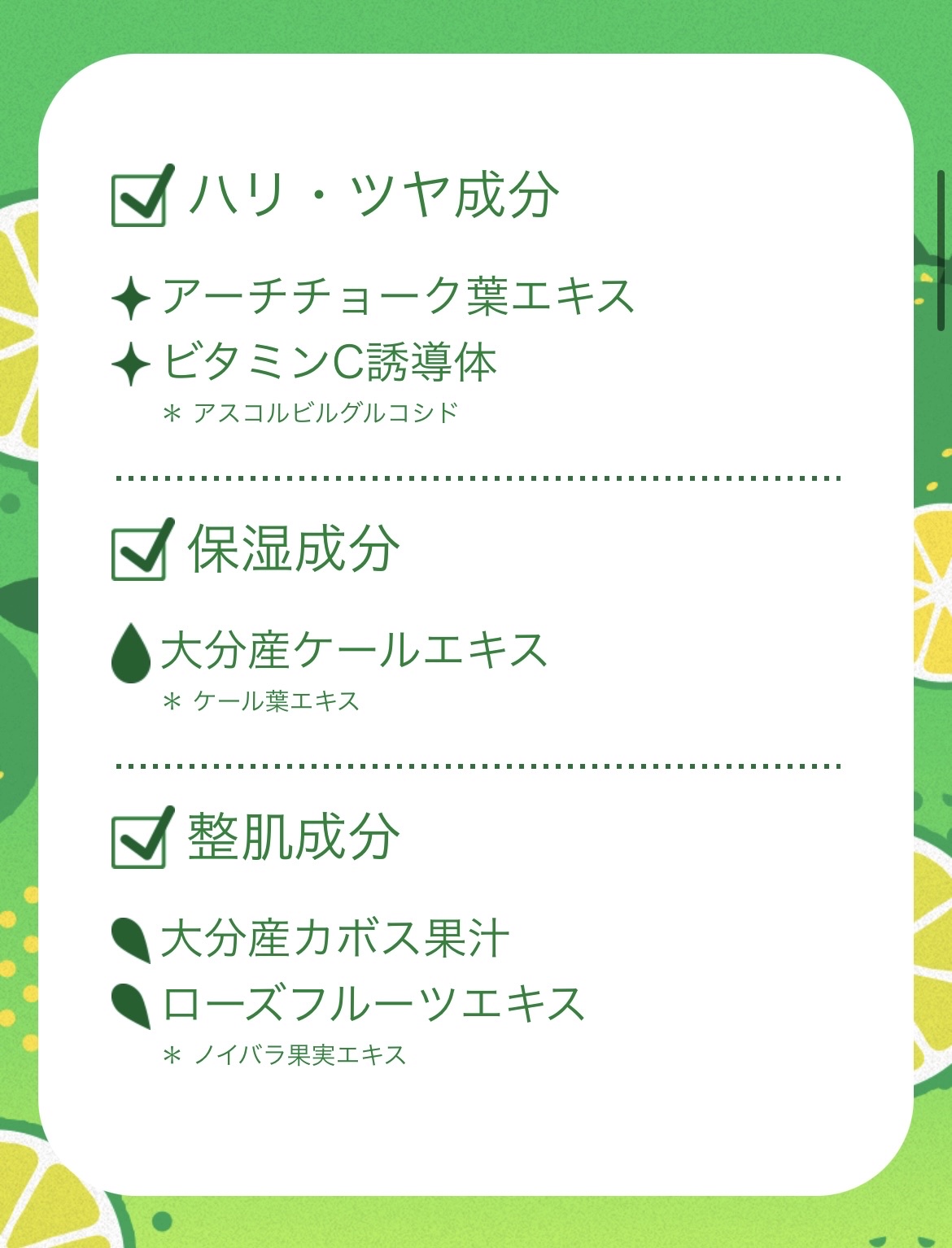 爽やかな香りとまろやかな酸味を持ち合わせるカボス。太陽の光を浴びて、青々と育ったその実は、隠したくなる悩みもふきとばすくらい爽やからしい。 気持ちもキュッっと引き締まるようなすっきり爽やかな香りに包まれながら、はじけるほど美しい肌を手に入れちゃいましょ♥ 💚🍏ハリ・ツヤ成分 アーチチョーク葉エキス ビタミンC誘導体 * アスコルビルグルコシド