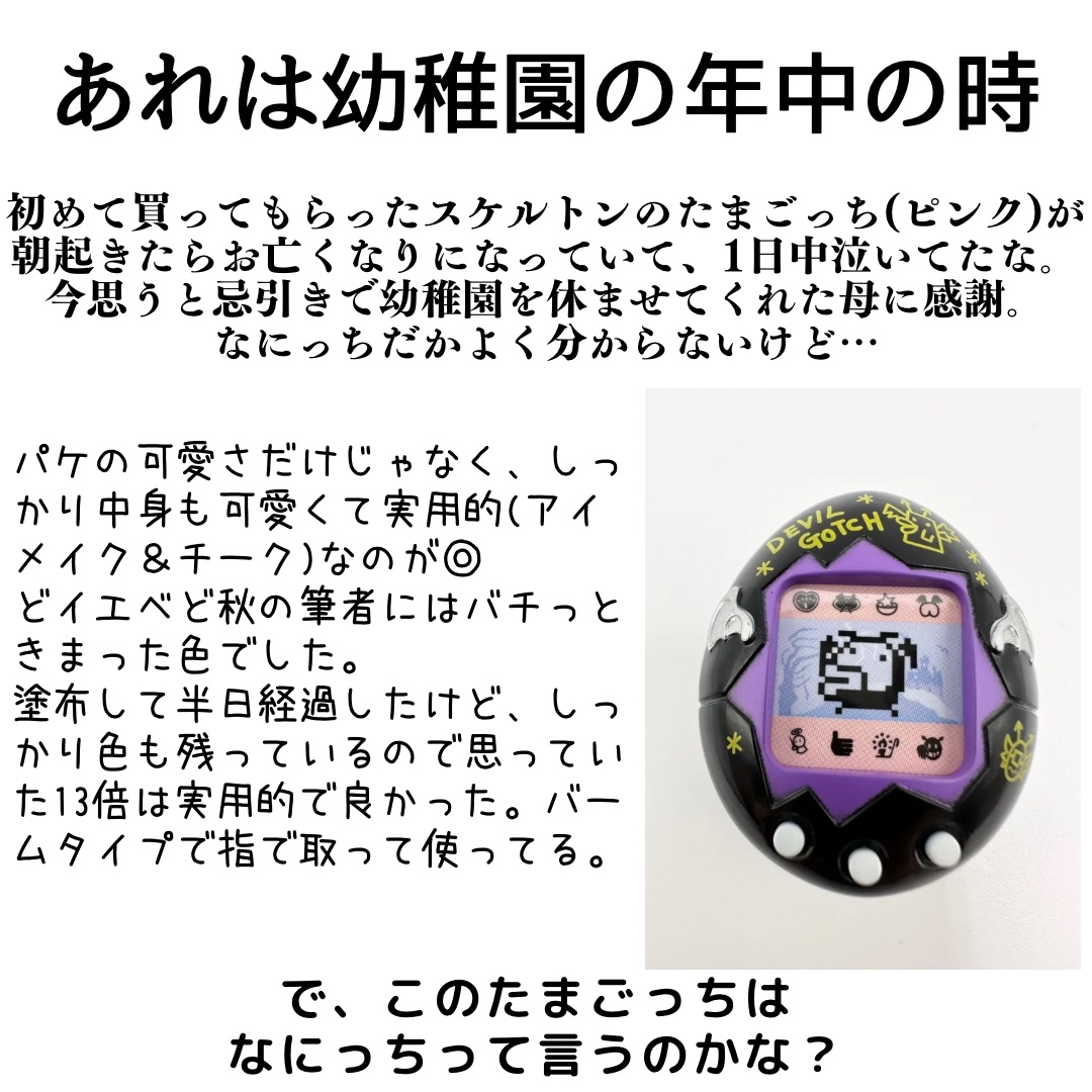 - 本商品は、キラキラとしたパール感を特徴とするハイライトカラーとして使えるコスメです。 薄づきなハイライトカラーで6色のカラーバリエーションとなります。 1996年より発売された初代「たまごっち」、1997年より発売された「てんしっちのたまごっち」、1998年より発売された「デビルっちのたまごっち」のたまごっち本体型ミニチュア容器に入っており、また、当時のパッケージをイメージした懐かしいパッケージデザインになっています。 約40.5×33mmで、ポーチなどに入れ持ち運びしやすいサイズ感です。 「てんしっちのたまごっち」シリーズからは“てんしっちパールピンク(カラー:シャイニーベビーピンク)”“てんしっちパールブルー(カラー:シャイニーミント)”“てんしっちパールホワイト(カラー:シャイニーミルキー)”の3種がラインナップされ、「デビルっちのたまごっち」からは“デビルっち黒(カラー:シャイニーブラウン)”、初代「たまごっち」からは“初代たまごっち水色(カラー:シャイニーピンク)”“初代たまごっちオレンジ(カラー:シャイニーゴールド)”の6種で展開いたします。 ふたの中央には6種それぞれ違うキャラクターがプリントされているので、自分の好きなキャラクターで選んだり、コスメの気になる色で選んだり、たまごっちのデザインで選んだり、ご自分に合った種類をお選びいただけます。