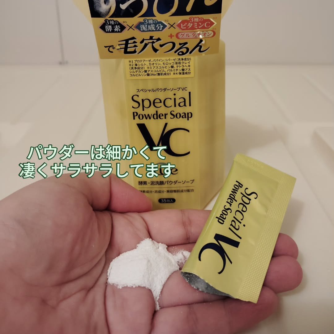 スペシャルパウダーソープVC3種の酵素※1(2種のタンパク質分解酵素・脂肪分解酵素)+3種の泥成分※2(クチャ・ガスール・ホワイトクイ)+3種のビタミンC※3配合のもちもち吸着泡で、毛穴の黒ずみ汚れ・角栓・ザラつき・くすみ※4を取り去って、透...