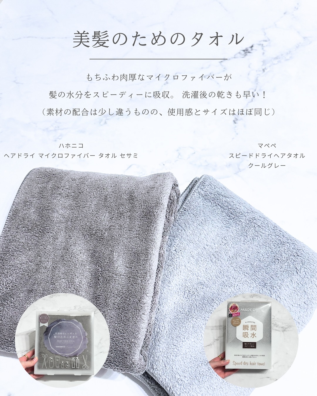 髪の毛にダメージを与えずに水分を拭き取るために買いました☆ 普通のタオルを使っていましたが、吸水力があまり感じられなくて。。。 マイクロファイバータオルが髪にダメージを与えずにスピード吸水してくれ、早く乾かせる事を知りました♪ ふんわりモチモチした肌触りで、お風呂上がりに髪の毛を拭くのに時間がかからず、髪の毛が乾くのが早い!!