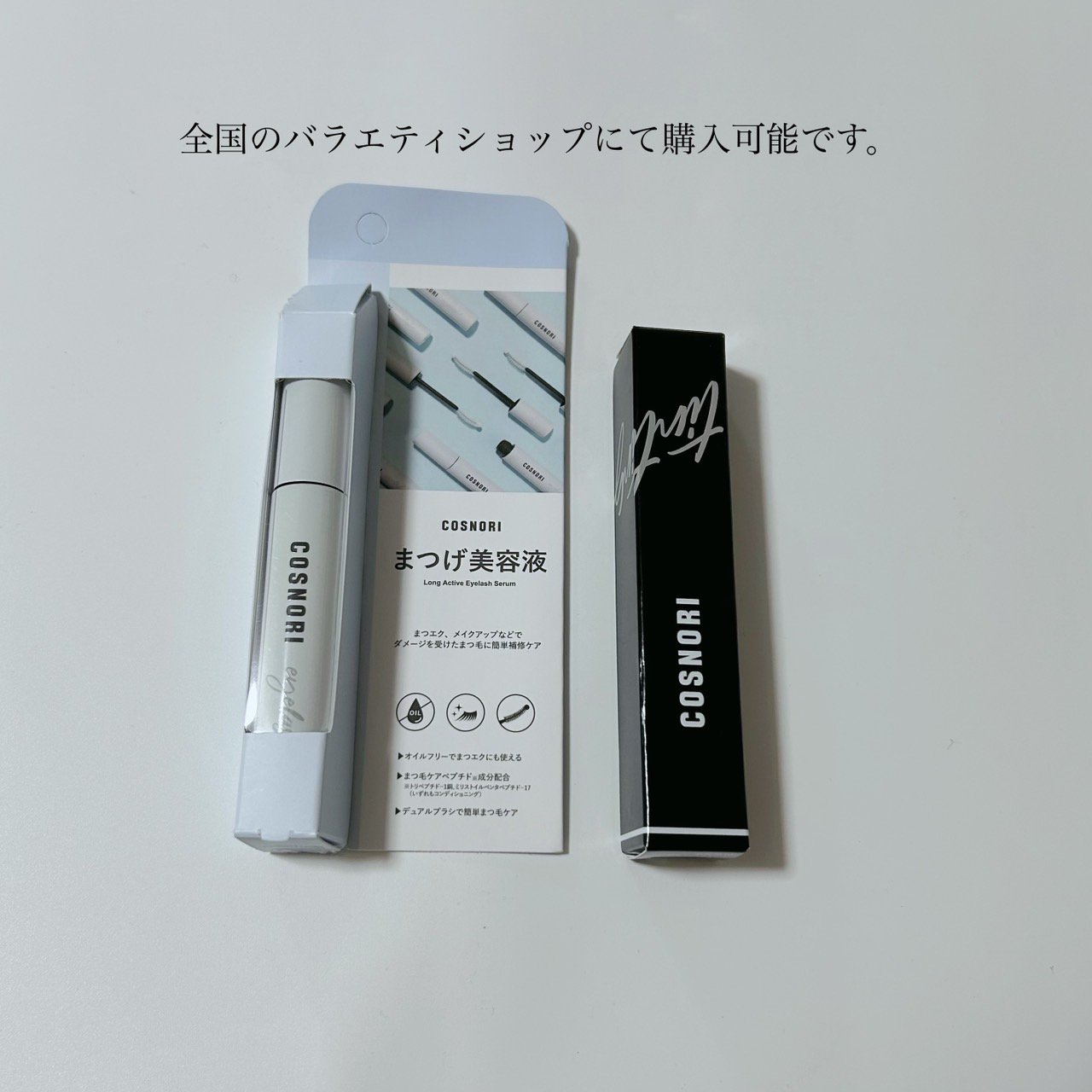 COSNORIの1番有名な白パケのロングアクティブアイラッシュセラムはオイルフリーのウォーターベースでしみたり色素沈着しないのが◎ 透け感のあるブラックジェルエッセンスが塗布すると自まつ毛がマツエクのまつ毛みたいな仕上がりになって自然に存在感が出るのが◎ どちらも2000円以下で試しやすいしQoo10などのオンラインだけでなくオフラインショップで購入できるよ.ᐟ.ᐟ