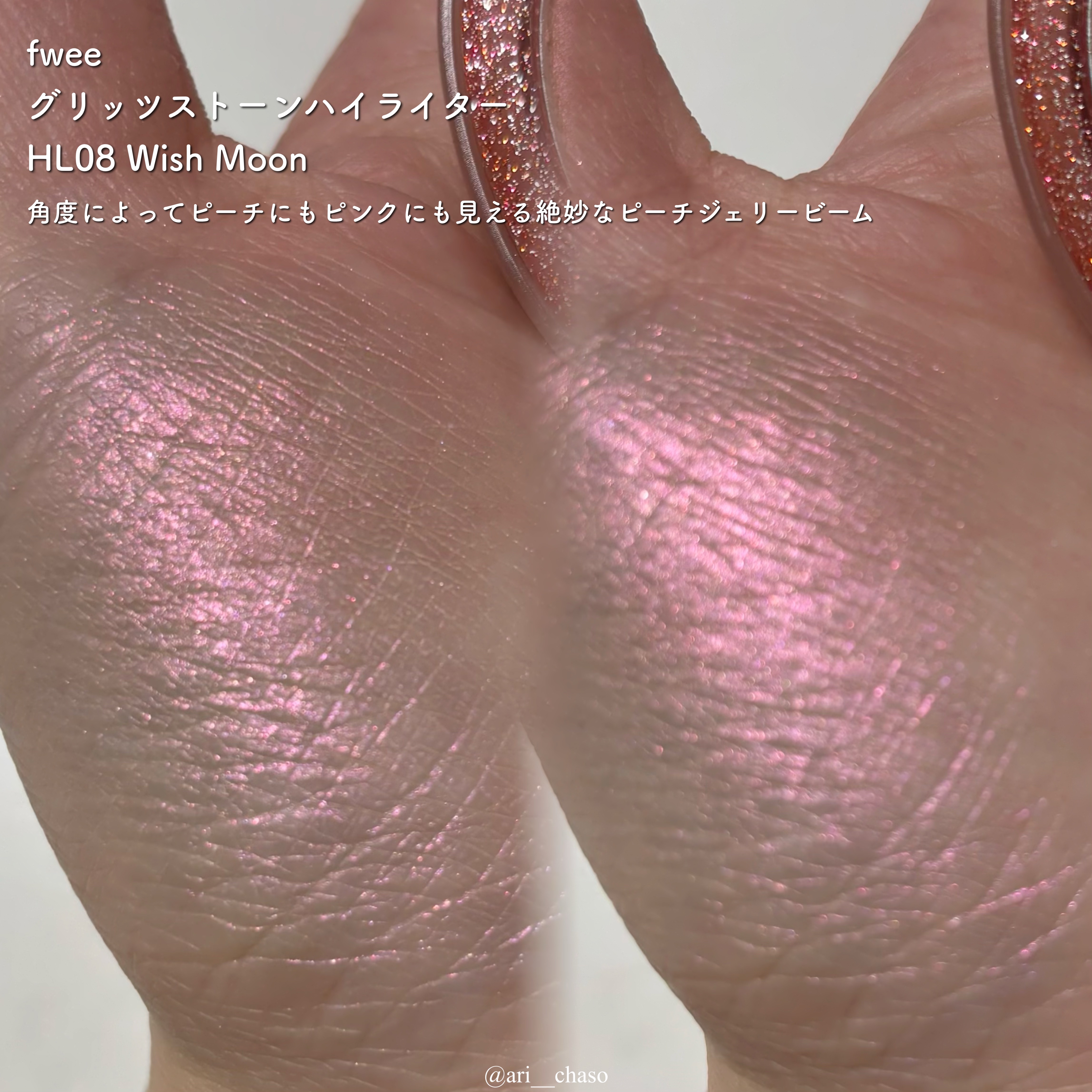 誕生石モチーフの12色のハイライター。HL08 ウィッシュムーンは角度によってピーチにもピンクにも輝くカラー。 肌なじみが良く綺麗なツヤ感を出せるのでデイリー使いにもおすすめ。 クリアな蓋&ラメに囲まれたパケも可愛いくて、何色も欲しくなるハイライターです!
