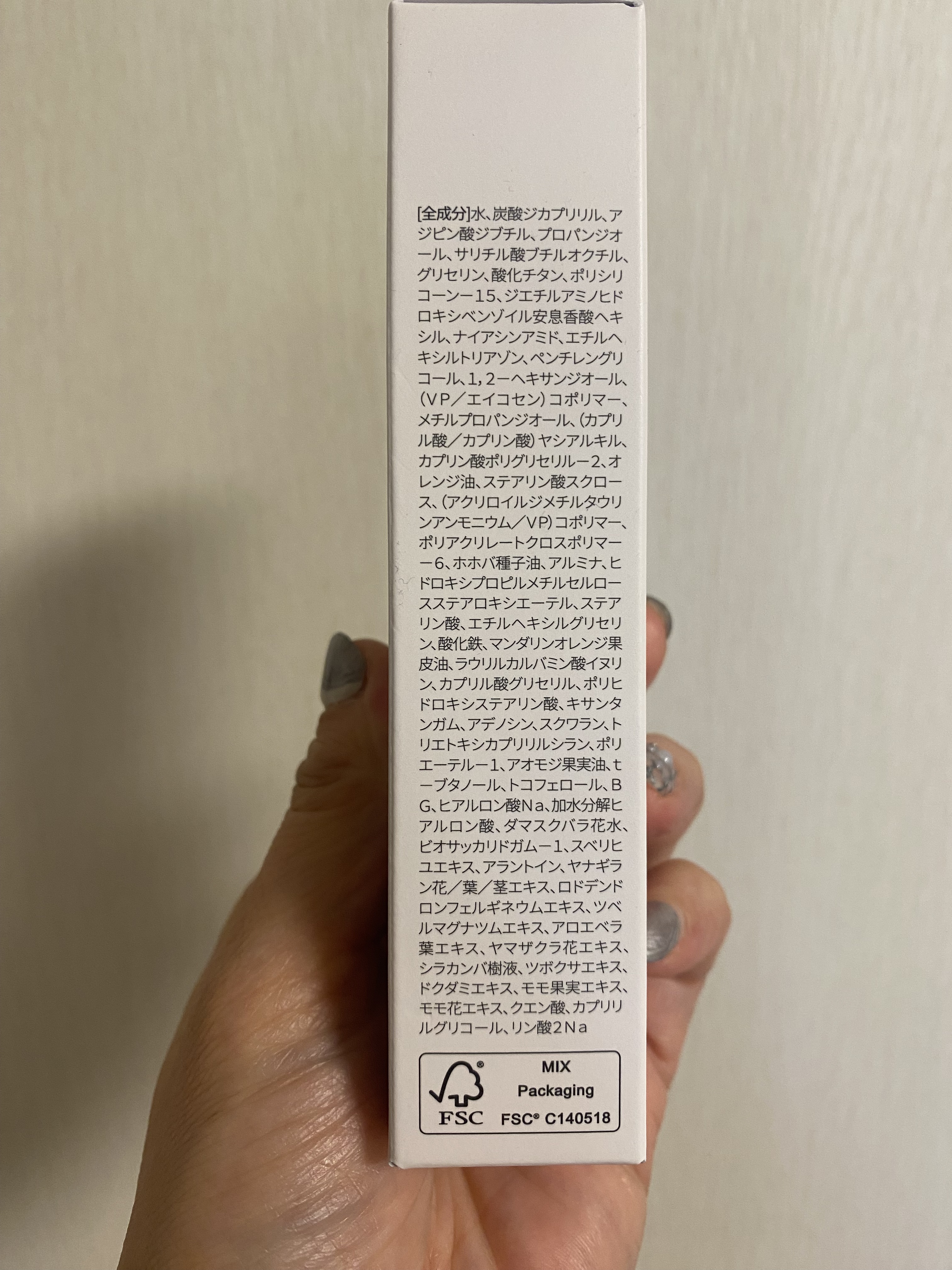 - <ピンク> 水、酸化チタン、ペンチレングリコール、BG、グリセリン、ヒアルロン酸Na、加水分解ヒアルロン酸、キサンタンガム、スクワラン、トコフェロール、アロエベラ葉エキス、ホホバ種子油、アルミナ、ステアリン酸、アジピン酸ジブチル、プロパンジオール、カプリリルグリコール、ポリヒドロキシステアリン酸、ヒドロキシプロピルメチルセルロースステアロキシエーテル、炭酸ジカプリリル、エチルヘキシルグリセリン、ツボクサエキス、ドクダミエキス、スベリヒユエキス、トリエトキシカプリリルシラン、アオモジ果実油、クエン酸、カプリル酸グリセリル、ロドデンドロンフェルギネウムエキス、1,2-ヘキサンジオール、アラントイン、ステアリン酸スクロース、オレンジ油、(アクリロイルジメチルタウリンアンモニウム/VP)コポリマー、ダマスクバラ花水、ナイアシンアミド、ラウリルカルバミン酸イヌリン、マンダリンオレンジ果皮油、(カプリル酸/カプリン酸)ヤシアルキル、リン酸2Na、リモネン、リナロール、シトラール、シラカンバ樹液、メチルプロパンジオール、アデノシン、ジエチルアミノヒドロキシベンゾイル安息香酸ヘキシル、ヤマザクラ花エキス、ビオサッカリドガム-1、t-ブタノール、ポリアクリレートクロスポリマー-6、ポリシリコーン-15、モモ果実エキス、ツベルマグナツムエキス、エチルヘキシルトリアゾン、ヤナギラン花/葉/茎エキス、(VP/エイコセン)コポリマー、カプリン酸ポリグリセリル-2、モモ花エキス、サリチル酸ブチルオクチル、ポリエーテル-1、酸化鉄(CI 77492)、酸化鉄(CI 77491)