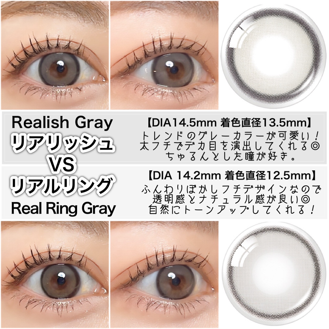 大好きなOLENSから新作Realishが登場!レンズデザインは自然なんだけど、トーンアップして太めフチでくりくりっと盛れる◎色素薄い裸眼っぽいRealRingと比べてみたよ!RealishDIA14.5mm着色直径13.5mm透明感のあるト...