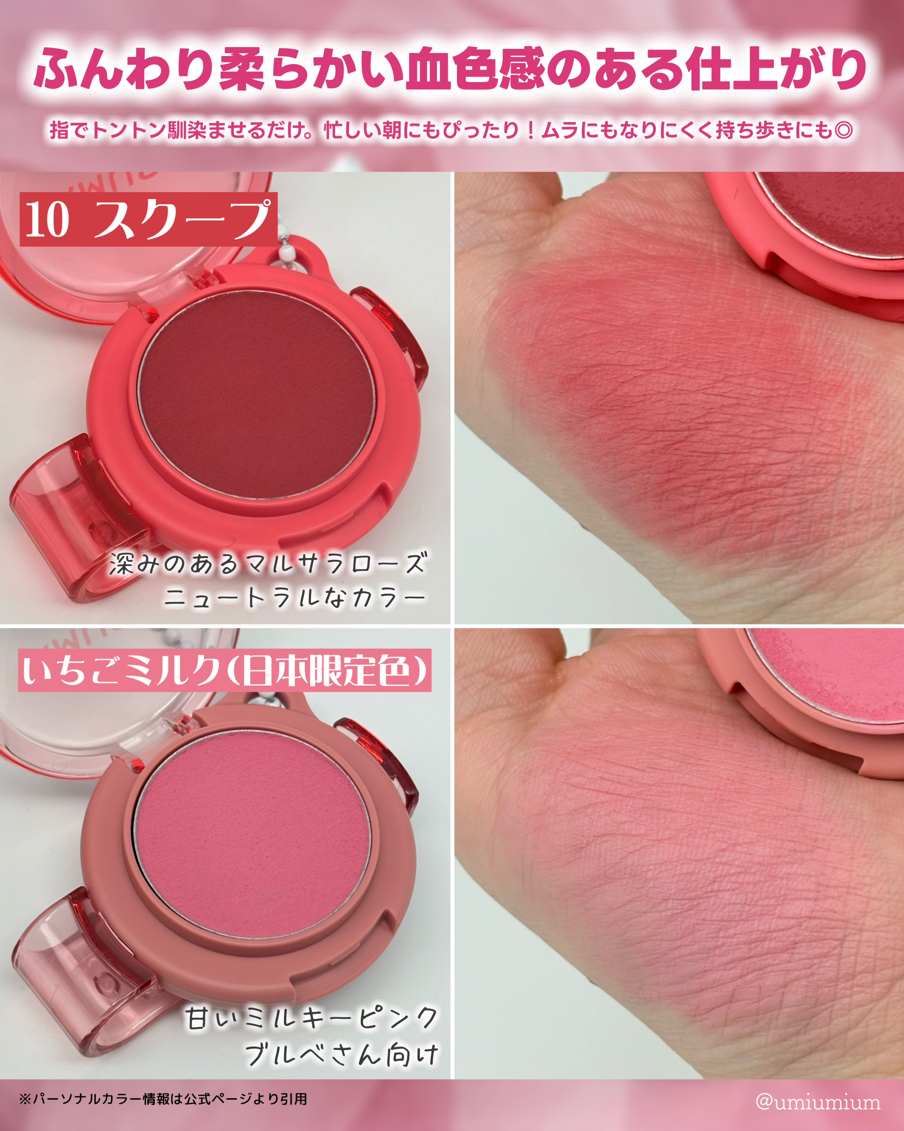 | チークランキング第10位 | 粒子の細かいしっとりサラサラな粉質は、肌にフワッと溶け込むように馴染み、上品なツヤ感が綺麗💖 | 詳細を見る | |