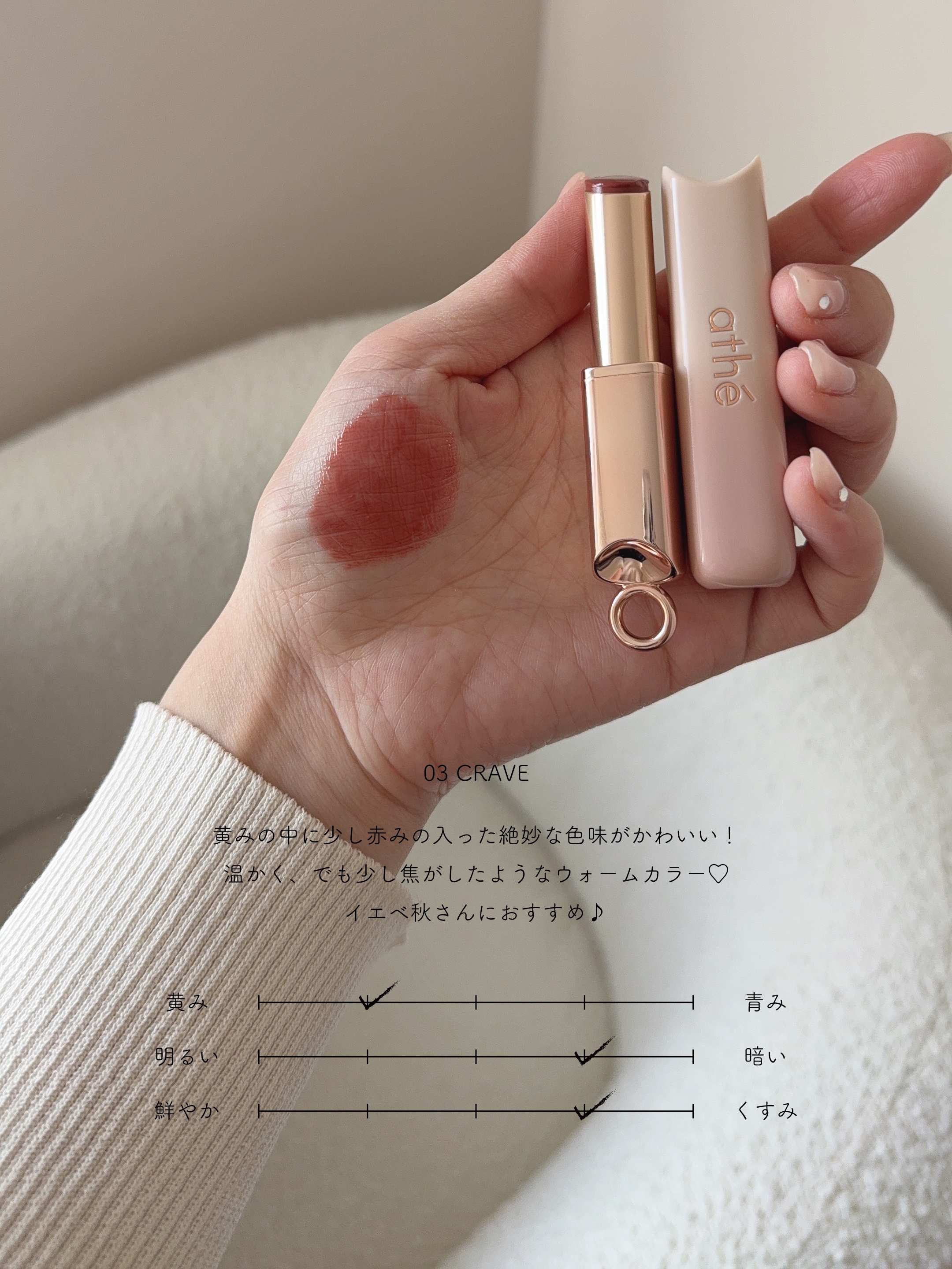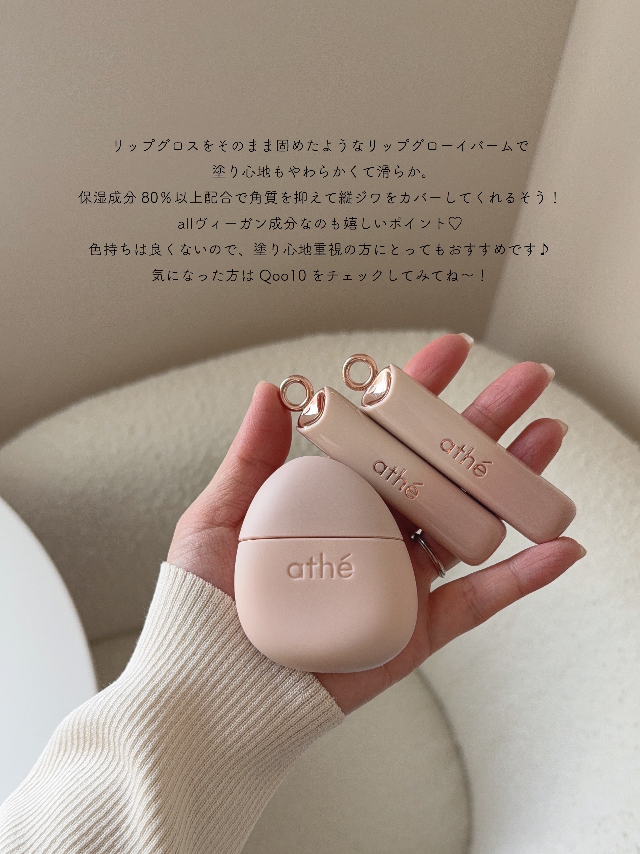 - athéからうるおい重視のヴィーガンリップ登場。コーティングしたようなぷるんとツヤのある唇に演出します。 #スリーピングマスクのような保湿感 #ふっくら*1&つやつや #ボリューム感*1演出 ☑ラッピング力:手のひらの温度(31-32℃)よりも低い唇の温度(28℃)でも溶けるテクスチャーにこだわり、ふっくら*1としたツヤ感。 ☑3色のカラー展開:1色でも使いやすく、重ね塗りでもより可愛いカラーに仕上げました。 ☑全体の80%以上が保湿成分:コラーゲン*2、ペプチド*2でハリ感を出し、スクワラン*2、セラミド*2で保湿。 ☑使用感:唇の温度で柔らかく溶け、角質をケアしながら唇にハリとツヤをプラス。 ☑こだわり容器:リップグローイバームはやわらかいテクスチャーのため、少しずつゆっくり繰り出せる容器に設計。 先端が丸いリング状になっており、お好みのチャーム等を付けてアレンジできるのも特徴。 マグネットで閉まる設計で容器が割れやすい問題にも対処しました。 *1 メイクアップ効果による *2 配合目的:保湿