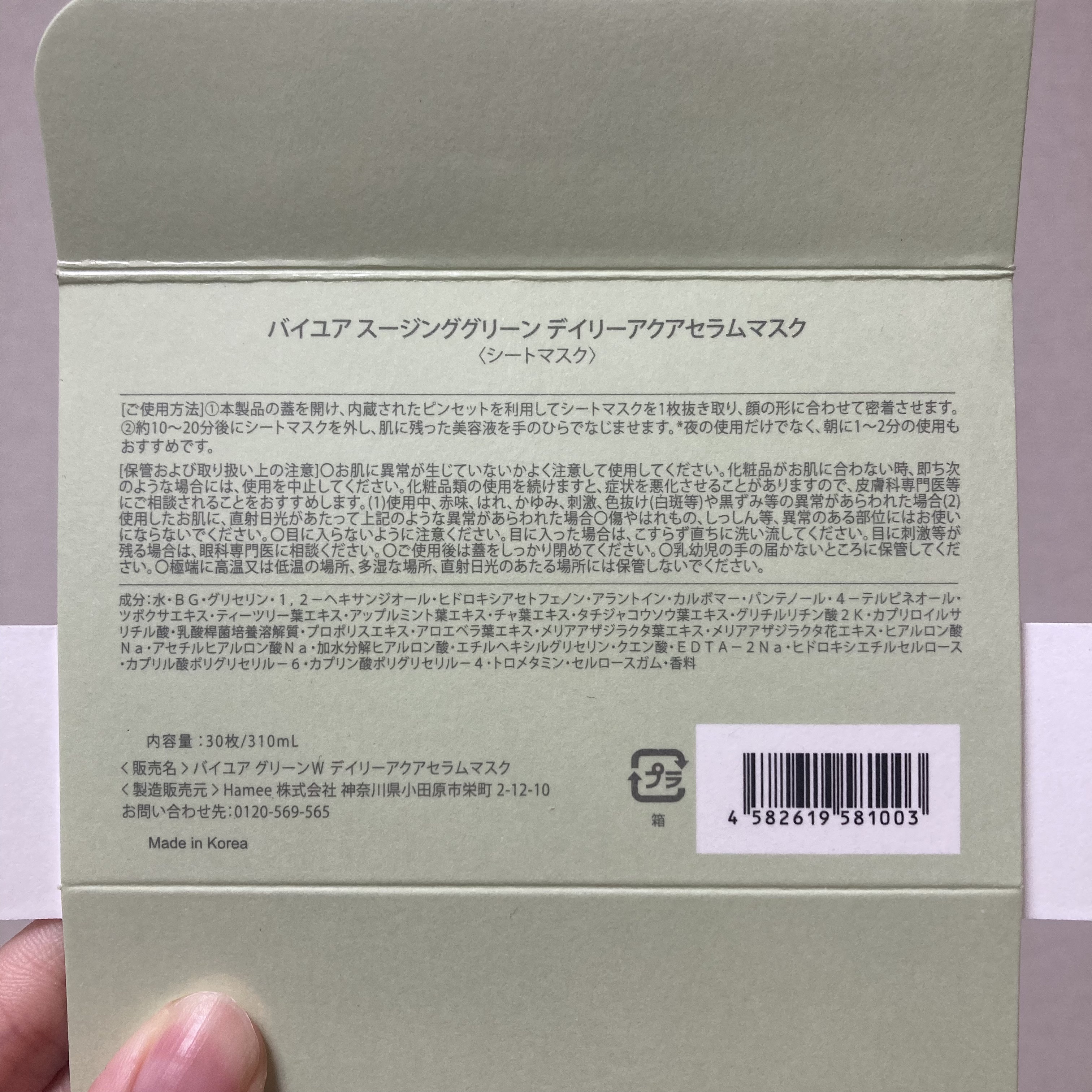 - <30枚(310g)> 水、BG、グリセリン、ヒアルロン酸Na、加水分解ヒアルロン酸、カルボマー、香料、アロエベラ葉エキス、チャ葉エキス、グリチルリチン酸2K、エチルヘキシルグリセリン、ツボクサエキス、セルロースガム、ヒドロキシエチルセルロース、クエン酸、アセチルヒアルロン酸Na、パンテノール、1,2-ヘキサンジオール、アラントイン、EDTA-2Na、トロメタミン、カプリロイルサリチル酸、カプリル酸ポリグリセリル-6、ヒドロキシアセトフェノン、プロポリスエキス、乳酸桿菌培養溶解質、メリアアザジラクタ葉エキス、メリアアザジラクタ花エキス、カプリン酸ポリグリセリル-4、アップルミント葉エキス、ティーツリー葉エキス、タチジャコウソウ葉エキス、4-テルピネオール