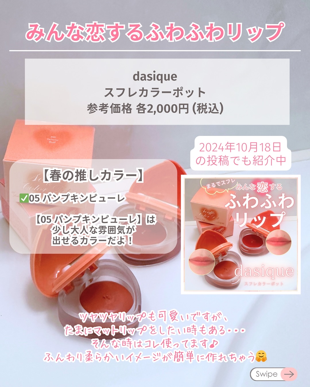 | 口紅・グロス・リップライナーランキング第104位 | ふわさらっしっとりとしたスフレテクスチャー🌼ミニリップブラシが入っていて、持ち運び時の塗り直しにも便利🥹 | 詳細を見る |