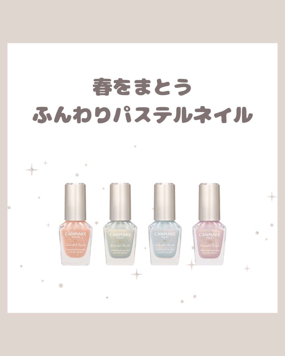 「キャンメイク」さまから商品提供をいただきました。みんな大好きカラフルネイルズから春らしいパステルカラーが限定で出たよ🫶☑️N111アプリコットキャンディーオーロラホロが入ったシアーオレンジ🧡透け感が可愛い♡☑️N112スプリングメドウゴール...