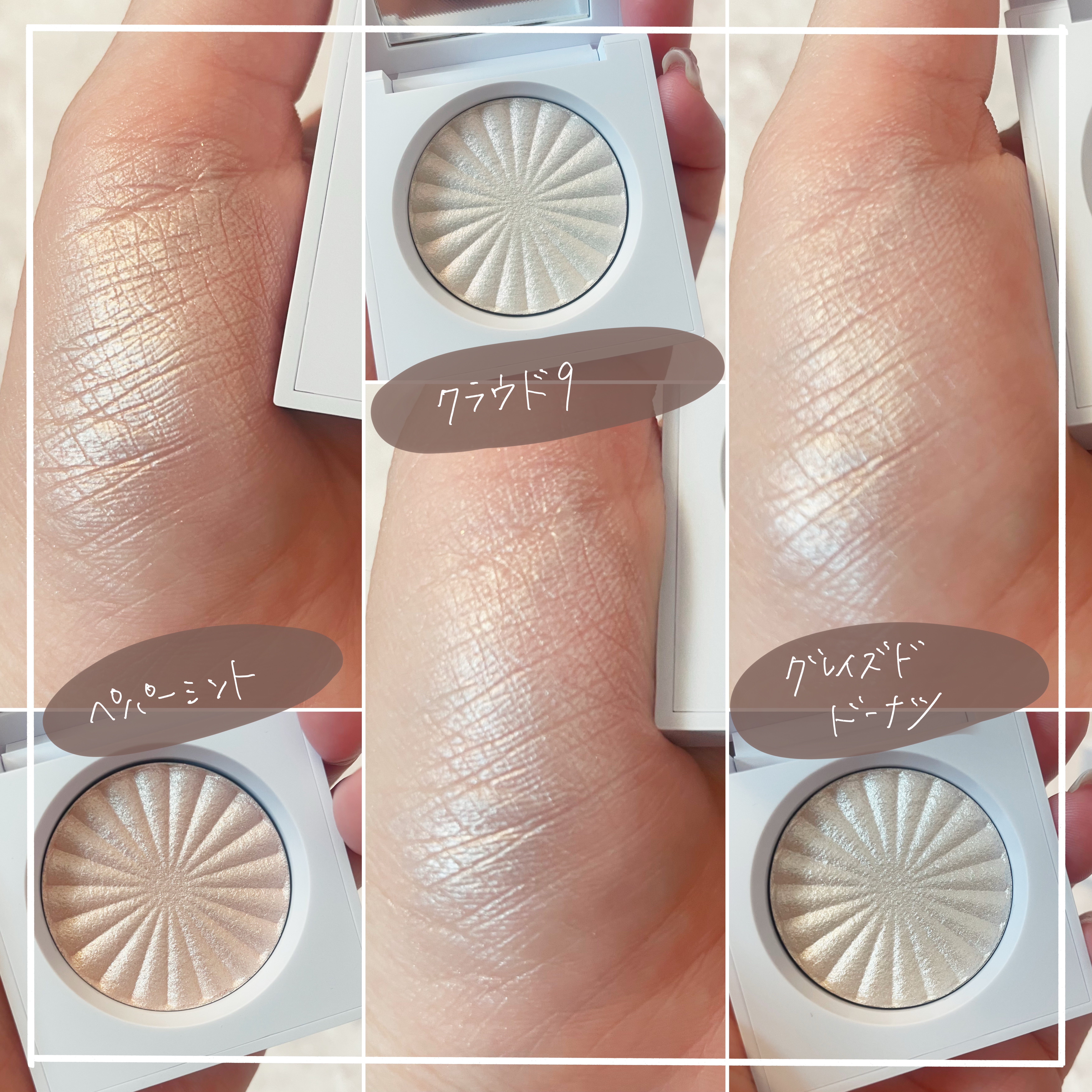 - 【Cloud9】イソドデカン、酸化チタン、マイカ、ジヘプタン酸ネオペンチルグリコール、ステアリン酸亜鉛、タルク、パルミチン酸エチルヘキシル、フェノキシエタノール、エタノール 【Glazed Donut】イソドデカン、マイカ、タルク、酸化チタン、ジヘプタン酸ネオペンチルグリコール、ステアリン酸亜鉛、パルミチン酸エチルヘキシル、フェノキシエタノール、酸化鉄、エタノール、酸化スズ【Pillow Talk】イソドデカン、タルク、マイカ、酸化チタン、ジヘプタン酸ネオペンチルグリコール、ステアリン酸亜鉛、パルミチン酸エチルヘキシル、フェノキシエタノール、酸化鉄、エタノール、赤201、酸化スズ【Star Island】イソドデカン、マイカ、タルク、酸化チタン、ジヘプタン酸ネオペンチルグリコール、ステアリン酸亜鉛、パルミチン酸エチルヘキシル、酸化鉄、フェノキシエタノール、カオリン、石英、エタノール【Peppermint】イソドデカン、マイカ、酸化チタン、ジヘプタン酸ネオペンチルグリコール、タルク、ステアリン酸亜鉛、パルミチン酸エチルヘキシル、酸化鉄、フェノキシエタノール、カオリン、石英、エタノール【Sugar Cookie】イソドデカン、マイカ、酸化チタン、ジヘプタン酸ネオペンチルグリコール、タルク、ステアリン酸亜鉛、パルミチン酸エチルヘキシル、酸化鉄、フェノキシエタノール、石英、カオリン、エタノール【Space Baby】 イソドデカン、マイカ、酸化チタン、ジヘプタン酸ネオペンチルグリコール、ステアリン酸亜鉛、タルク、パルミチン酸エチルヘキシル、フェノキシエタノール、エタノール 【Out of This World】 イソドデカン、酸化チタン、マイカ、ジヘプタン酸ネオペンチルグリコール、ステアリン酸亜鉛、パルミチン酸エチルヘキシル、タルク、フェノキシエタノール、酸化スズ、エタノール 【Rodeo Drive】 イソドデカン、マイカ、タルク、酸化チタン、ステアリン酸亜鉛、ジヘプタン酸ネオペンチルグリコール、パルミチン酸エチルヘキシル、酸化鉄、フェノキシエタノール、酸化スズ、エタノール、赤202【Bali】イソドデカン、タルク、マイカ、酸化チタン、ジヘプタン酸ネオペンチルグリコール、ステアリン酸亜鉛、パルミチン酸エチルヘキシル、フェノキシエタノール、酸化鉄、酸化スズ、エタノール 【Blissful】イソドデカン、マイカ、タルク、ステアリン酸亜鉛、酸化チタン、ジヘプタン酸ネオペンチルグリコール、パルミチン酸エチルヘキシル、酸化鉄、フェノキシエタノール、エタノール