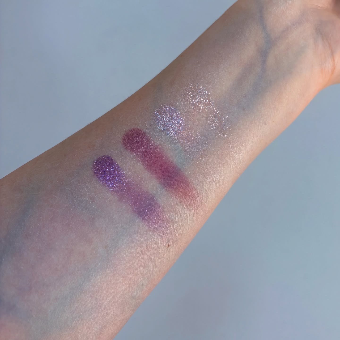 ホリデーシーズンらしい煌めきに一目惚れ✨特に気になった2色を買ってみました♡お値段も1つ1100円と、手に取りやすい🤭 アイカラー、チーク、リップにとマルチに使えるのも🙆💘 まだメイクには使っていないので耐久性とかは未知ですが…可愛すぎて取り急ぎスウォッチをば!♡スティック系って苦手意識あるのだけど買っちゃった!w