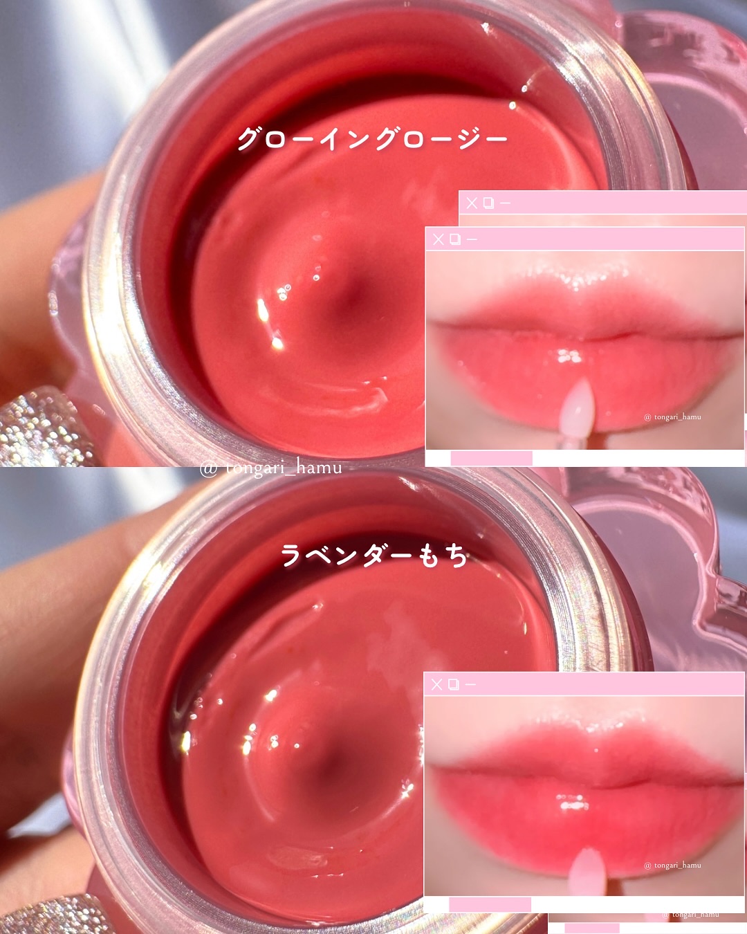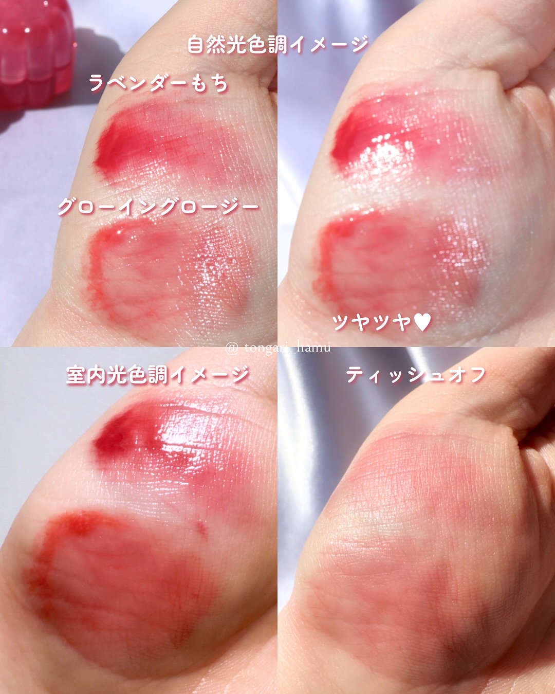 みんな大好きなやつ ティントで落ちにくいからそんなに気を遣わなくていいのにラメまで入ってるのは反則 ラメのおかげで輝きが増してる そもそもボムティントがそこそこ艶感あったのに、ラメで光の反射が加わってさらにツヤツヤに…!! 上唇はぼかして塗って、下唇中央を多めに塗るとぽってりして可愛いと思う