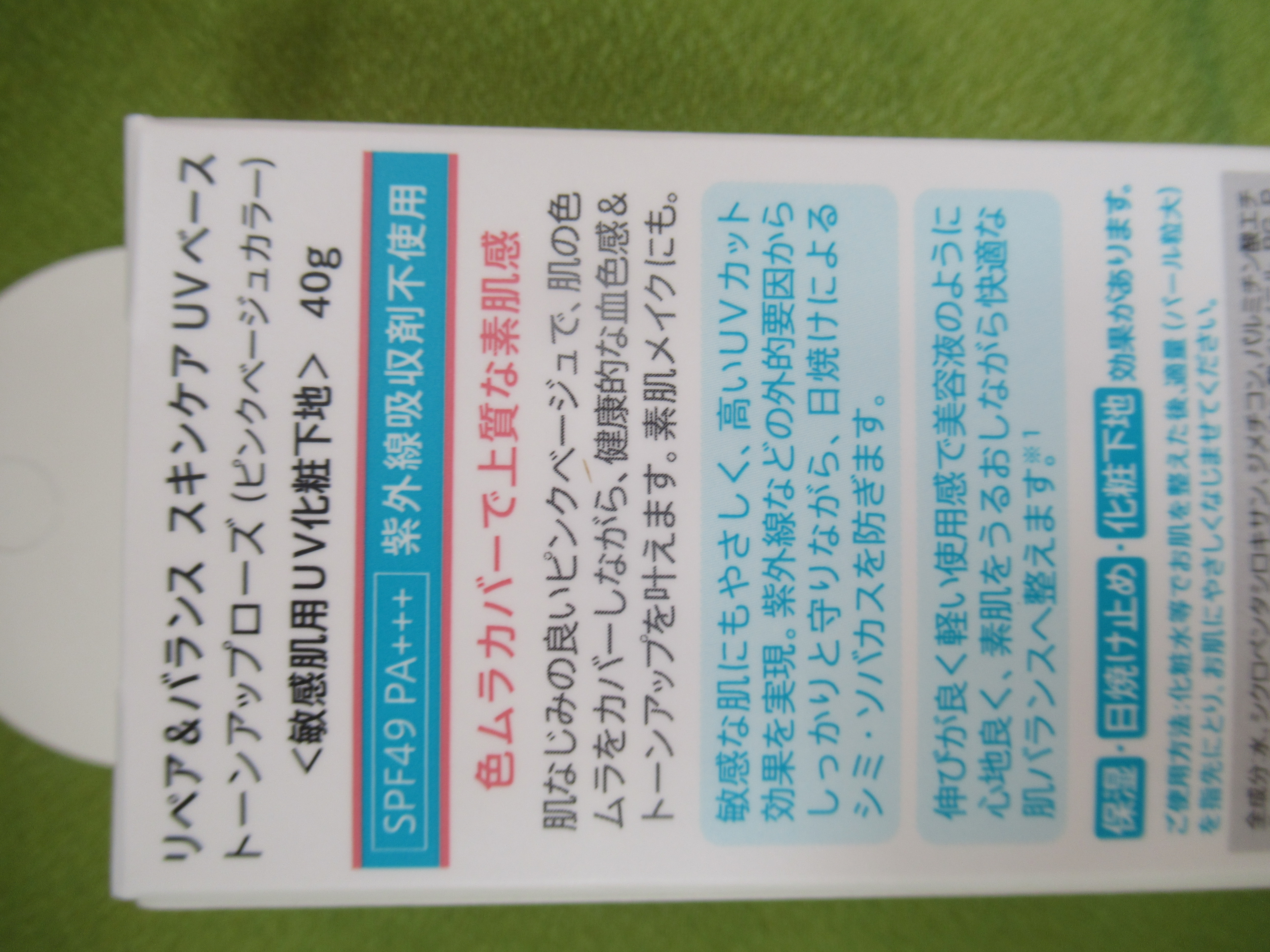 - ノンケミカルのゆらぎ敏感肌向けスキンケアUVベースの新色が誕生!SPF49 PA+++ ①紫外線カット効果 SPF49 PA+++の高い紫外線カット効果 紫外線吸収剤フリーの安心処方 ②健康的な素肌感仕上げ 肌なじみの良いピンクベージュが黄身を消して色ムラをカバー 健康的な血色感を演出し、トーンアップ効果をもたらします ③肌保護効果 肌のうるおいを保つスキンケア効果で、ゆらがない肌に 導きます。