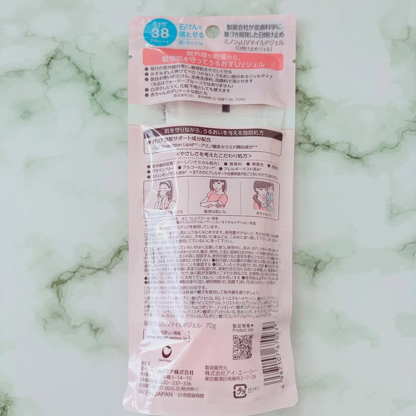 - SPF38 PA+++ 紫外線から敏感肌を守ってうるおすジェルタイプの日焼け止め。みずみずしくのびてべたつかない。顔にもからだにも使えます。白浮きしにくいため、化粧下地にも。いつもお使いの石けん、全身洗浄料、洗顔料で落とせます。家族みんなのUV対策に。 【肌を守りながら、うるおいを与える独自処方】 バリア機能サポート成分(保湿)配合(Self Protection Lipid※1・アミノ酸系セラミド類似成分※2) 【肌へのやさしさを考えたこだわり処方】 紫外線吸吸収剤フリー、パラベンフリー、アルコールフリー※3、無香料・無着色、弱酸性、アレルギーテスト済み、スティンギングテスト済み。(全ての方にアレルギーや皮膚刺激が起こらないわけではありません) ※1 コレステロール:保湿 ※2 ラウロイルグルタミン酸ジ(コレステリル/ベヘニル/オクチルドデシル):保湿 ※3 エチルアルコール無添加