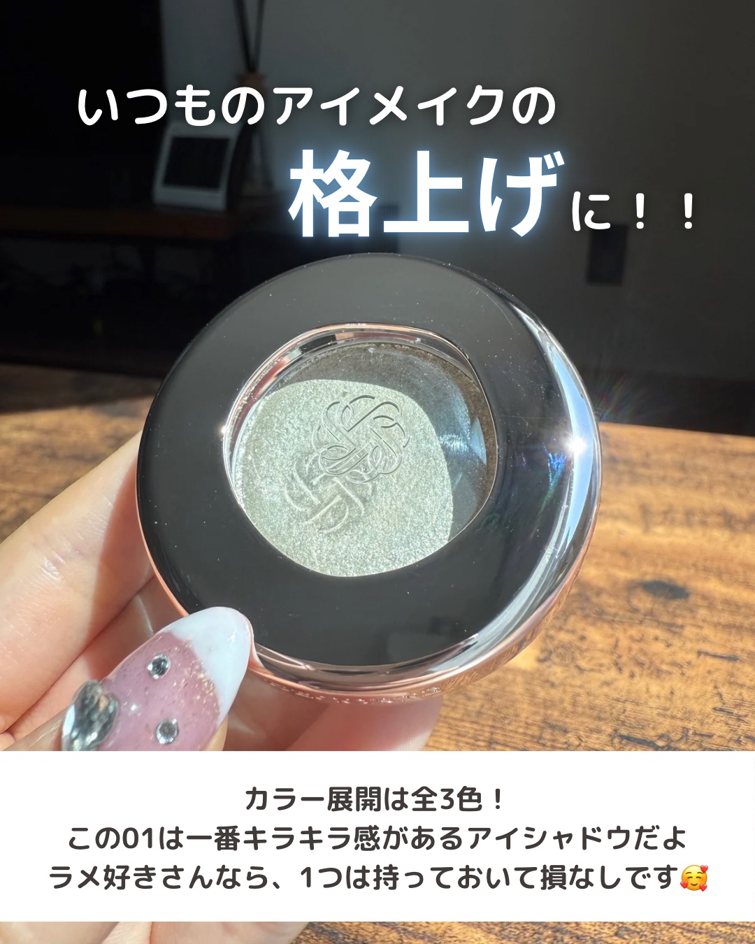 輝度の高いシングルラメカラー。宝石を砕いたかのような存在感のあるキラキラ感だけど 粒が大きすぎず、大人も使いやすい◎ しっとりした粉質でラメ飛びしにくく ひと塗りで華やかで存在感のある目元に。