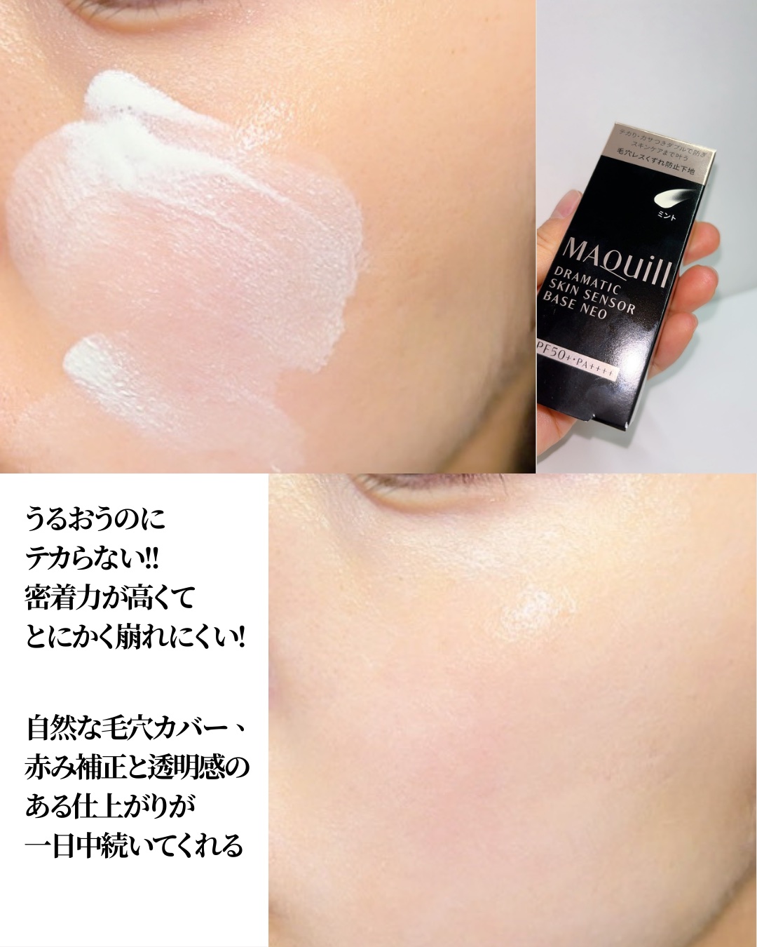 - ドラマティックスキンセンサーベース NEO<化粧下地・美容液> 売上 No.1化粧下地*のドラマティックスキンセンサーベース EX UV+のくずれ防止効果、毛穴カバー効果をさらに強化し、 新たにスキンケア機能まで搭載した毛穴レスくずれ防止下地です。 SPF50+・PA++++で、強力な紫外線から肌を守ります。 ◆POINT1 テカリ・カサつきダブルで防ぐ最強くずれ防止効果 新たに肌全体を覆う「うるさらセンサーコート」を搭載。湿度に応じて、コートという面状で水分の通しやすさを調整することが可能となったため、どんな時でも快適な肌状態をキープする力が向上! べたつく環境では、うるさらセンサーコートが水分透過性を高めるため、さらさらキープ 乾燥する環境では、うるさらセンサーコートが水分透過性を下げるため、うるおいキープ ◆POINT2 塗った瞬間「キレイな素肌」な毛穴補正効果 毛穴補正パウダーに加え、新配合・オイル生まれのポアレスジェリーがとろけるように凹凸をうめながら毛穴をぼかしてカバーし、透明感のある仕上がりに。 ◆POINT3 使うたび うるおうスキンケア効果 浸透型うるおい美容液が、角層のすみずみまでうるおいを届け、持続。使うたび、うるおって毛穴が目立たない本物の「キレイな素肌」へ。 *インテージSRI+, 化粧下地市場(期間2022/1~2022/12), 品種別金額シェア ※ミントは企業限定発売。取扱企業は、ウエルシアグループ、スギ薬局、ツルハグループ(ツルハドラッグ・くすりの福太郎・ドラッグストアウェルネス・ドラッグストアウォンツ・くすりのレデイ・杏林堂スーパードラッグストア・B&D ドラッグストア・ドラッグイレブン)、トモズです。 店舗によってお取り扱いがない場合がございます。