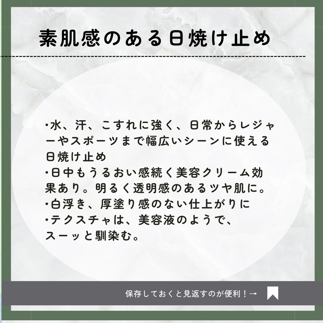 | 日焼け止め・UVケアランキング第10位 | ふわっとした硬めのクリームだけど、 するっと伸びが良く、 なじませているうちに水感を感じ、 なじむとベタつきなく さらっと軽い使い心地だよ。 | 詳細を見る | |