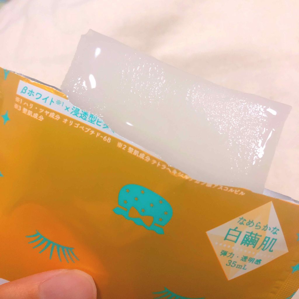 1枚だけ袋に入ってるタイプで贅沢✨ 袋に残った美容液はボディローションとしても使えて一晩で全身ケアできちゃいます♪ とろとろ美容液でしっとり感がハンパない! つけてる時も気持ちいいし、朝の肌触りもイイ✨ 透明感 こっちもとろみ美容液なんだけど、首やボディにはこっちの方がつけやすいかな。