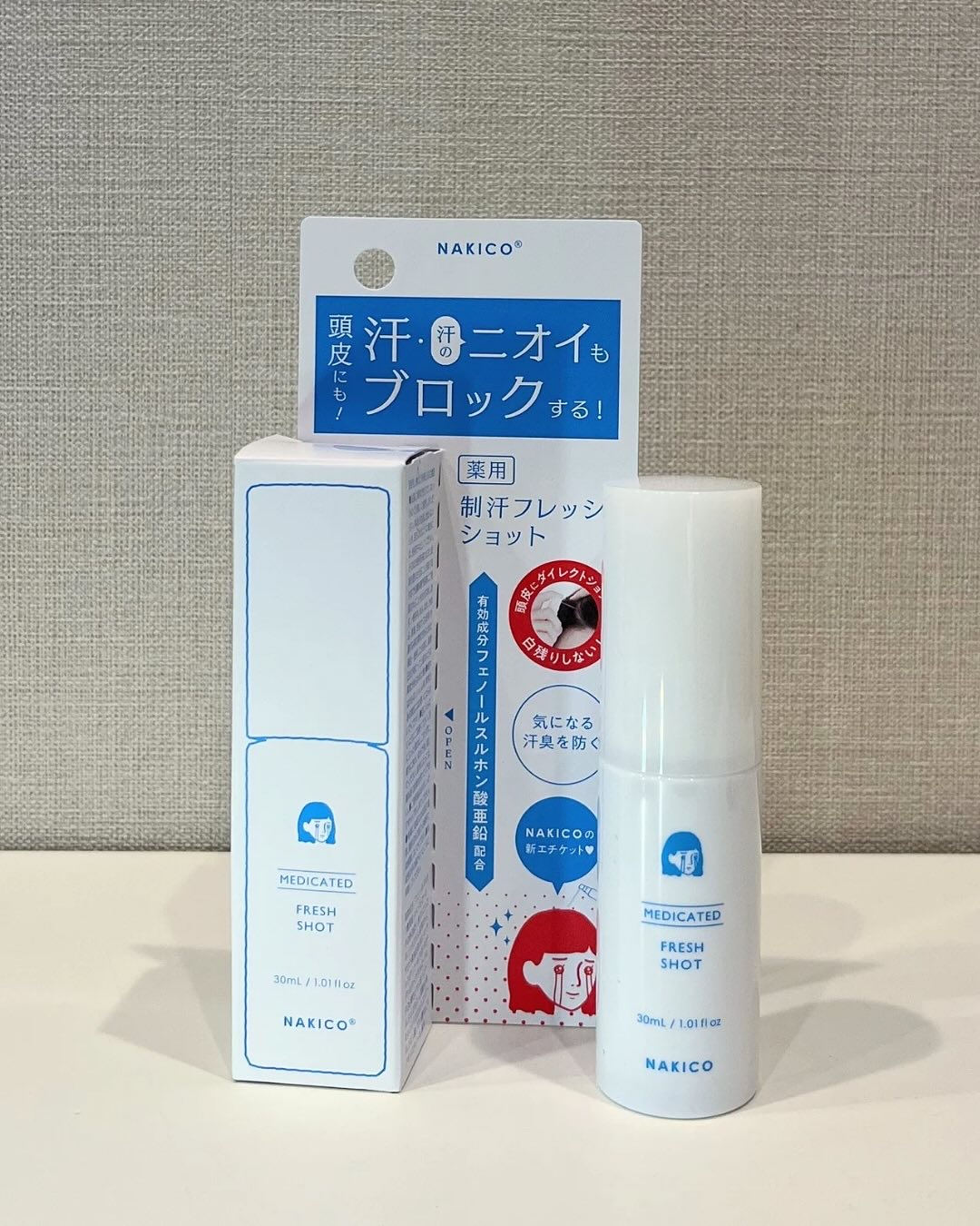 - 【医薬部外品】 日常の生活シーンでの気になる頭まわりのニオイや汗問題に着目。NAKICOの新作「薬用制汗フレッシュショット」はフェノールスルホン酸亜鉛とイソプロピルメチルフェノールのW主剤*配合の制汗ミストです。直接肌に届きやすいダイレクトノズル採用で使いやすい設計。メントール配合で清涼感もプラス。フレッシュグレープフルーツの爽やかな香り。 有効成分:フェノールスルホン酸亜鉛、シメン-5-オール