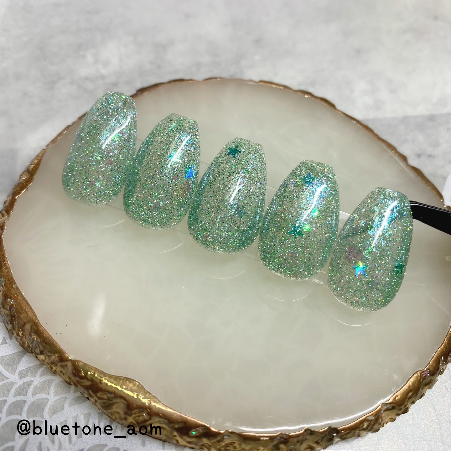 ラメがしっかりしてるし クリアカラーが入ってるから オーロラパウダー無しでも 充分キラキラしました! 反射強めのフィルムなので 実物はもっと うるうるとキラキラが強いです! ビー玉みたい🥺 ネイルシール長持ちさせたいけど ちょっと飽きてきたな〜って時とかに 全然違った印象になるのでオススメです! Seriaのベースジェル 本当にうるうるネイルしやすいので オススメしたい🙆♀️