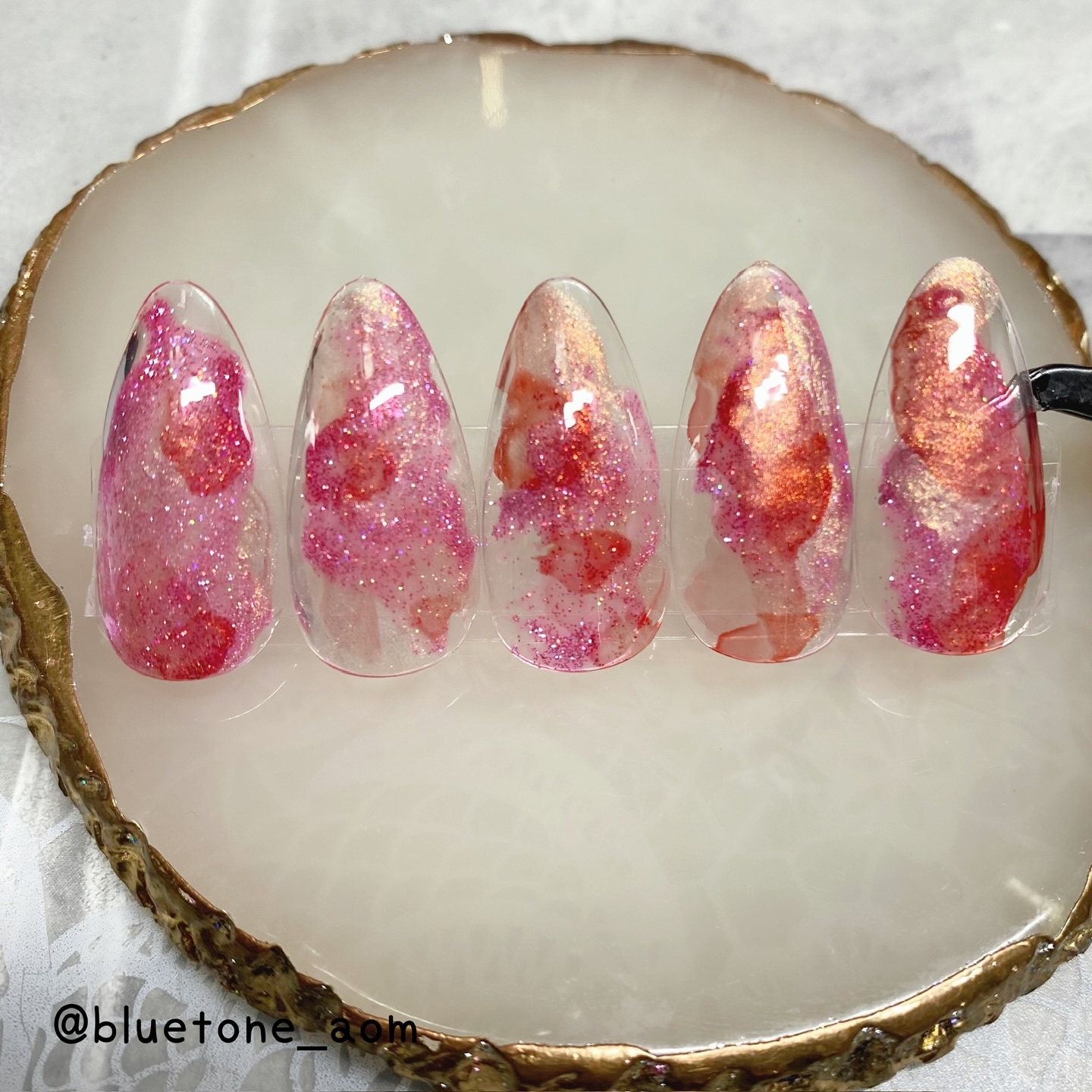 ラメがしっかりしてるし クリアカラーが入ってるから オーロラパウダー無しでも 充分キラキラしました! 反射強めのフィルムなので 実物はもっと うるうるとキラキラが強いです! ビー玉みたい🥺 ネイルシール長持ちさせたいけど ちょっと飽きてきたな〜って時とかに 全然違った印象になるのでオススメです! Seriaのベースジェル 本当にうるうるネイルしやすいので オススメしたい🙆♀️