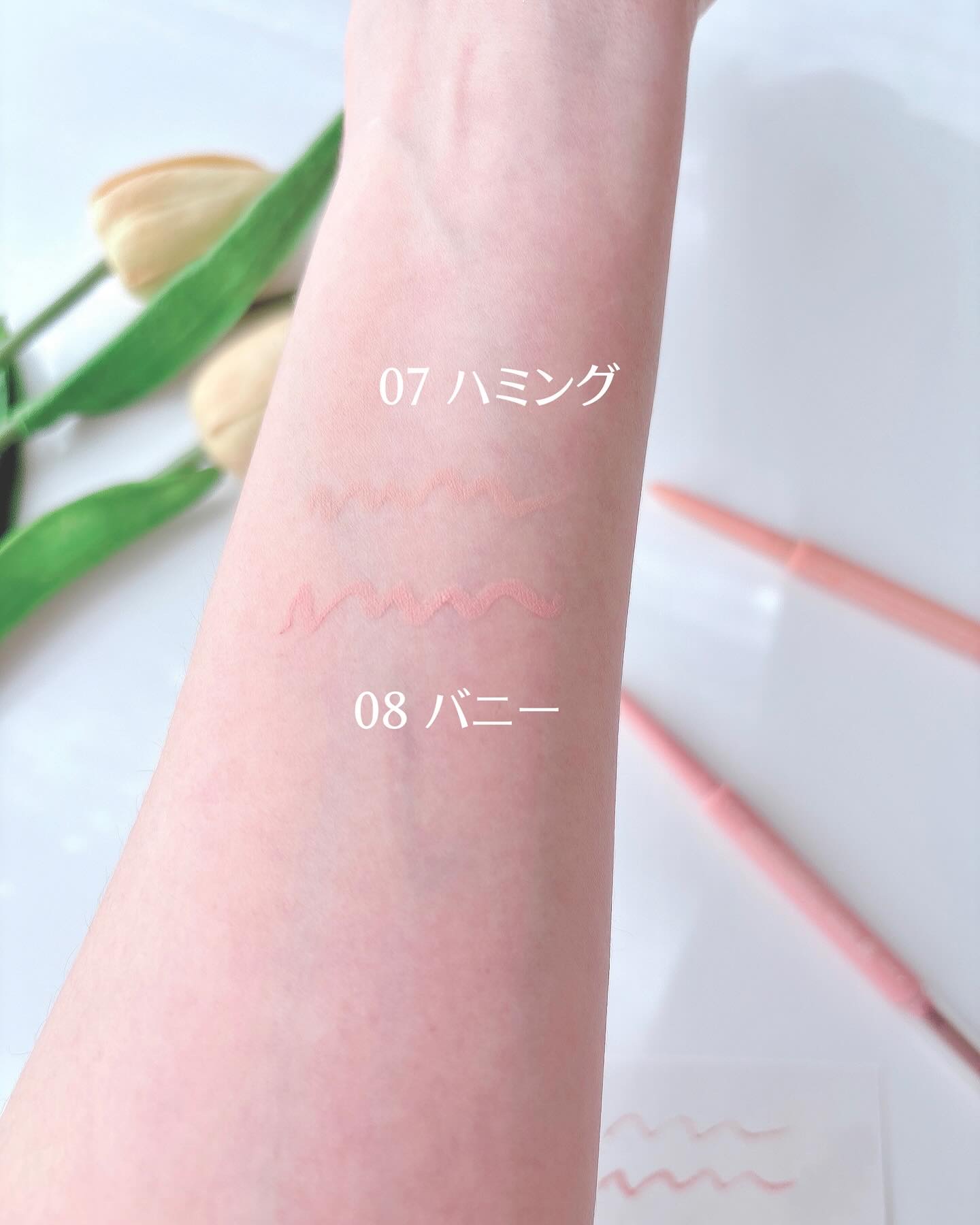 - <02 ファジー(Fuzzy)> トリメチルシロキシケイ酸、メチルトリメチコン、マイカ、合成ワックス、イソヘキサデカン、酸化鉄、グンジョウ、酸化チタン、セレシン、カルナウバロウ、トリイソステアリン酸ポリグリセリル-2、セテアリルアルコール、(アクリレーツ/アクリル酸ステアリル/メタクリル酸ジメチコン)コポリマー、オクチルドデカノール、マンガンバイオレット、メチコン、ジメチコン、水酸化Al、ジステアルジモニウムヘクトライト、炭酸プロピレン、カオリン <04 メロウ(Mellow) > トリメチルシロキシケイ酸、メチルトリメチコン、マイカ、合成ワックス、イソヘキサデカン、酸化チタン、酸化鉄、セレシン、カルナウバロウ、トリイソステアリン酸ポリグリセリル-2、セテアリルアルコール、(アクリレーツ/アクリル酸ステアリル/メタクリル酸ジメチコン)コポリマー、オクチルドデカノール、青1、水酸化Al、ジメチコン、メチコン、赤202、ジステアルジモニウムヘクトライト、リンゴ酸ジイソステアリル、炭酸プロピレン <05 ポッシュ(Posh)> トリメチルシロキシケイ酸、メチルトリメチコン、マイカ、合成ワックス、イソヘキサデカン、酸化鉄、酸化チタン、セレシン、カルナウバロウ、トリイソステアリン酸ポリグリセリル-2、(アクリレーツ/アクリル酸ステアリル/メタクリル酸ジメチコン)コポリマー、セテアリルアルコール、オクチルドデカノール、リンゴ酸ジイソステアリル、メチコン、ジメチコン、水酸化Al、ジステアルジモニウムヘクトライト、赤202、炭酸プロピレン、トリイソステアリン酸イソプロピルチタン <06 ダスク(Dusk)> トリメチルシロキシケイ酸、メチルトリメチコン、マイカ、合成ワックス、イソヘキサデカン、酸化鉄、酸化チタン、セレシン、カルナウバロウ、トリイソステアリン酸ポリグリセリル-2、セテアリルアルコール、(アクリレーツ/アクリル酸ステアリル/メタクリル酸ジメチコン)コポリマー、オクチルドデカノール、メチコン、ジメチコン、水酸化Al、ジステアルジモニウムヘクトライト、炭酸プロピレン <07 ハミング(Humming)> 酸化チタン、合成ワックス、エチルヘキサン酸アルキル(C12-15)、オクチルドデカノール、トリイソステアリン酸ポリグリセリル-2、イソヘキサデカン、セレシン、カルナウバロウ、(VP/ヘキサデセン)コポリマー、(アクリル酸アルキル/アクリル酸ステアリル/アクリル酸ジメチコン)コポリマー、シリカ、黄4、水酸化Al、セテアリルアルコール、ポリイソブテン、ジメチコン、トリイソステアリン酸イソプロピルチタン、青1、マイカ、メチコン <08 バニー(Bunny)> 酸化チタン、合成ワックス、エチルヘキサン酸アルキル(C12-15)、オクチルドデカノール、トリイソステアリン酸ポリグリセリル-2、イソヘキサデカン、セレシン、カルナウバロウ、(VP/ヘキサデセン)コポリマー、(アクリル酸アルキル/アクリル酸ステアリル/アクリル酸ジメチコン)コポリマー、シリカ、黄4、水酸化Al、セテアリルアルコール、ポリイソブテン、ジメチコン、トリイソステアリン酸イソプロピルチタン、青1、マイカ、メチコン <10 ライク(Like)> トリメチルシロキシケイ酸、メチルトリメチコン、マイカ、合成ワックス、イソヘキサデカン、酸化チタン、セレシン、黄4、カルナウバロウ、トリイソステアリン酸ポリグリセリル-2、酸化鉄、赤202、(アクリル酸アルキル/アクリル酸ステアリル/アクリル酸ジメチコン)コポリマー、セテアリルアルコール、オクチルドデカノール、水酸化Al、青1、メチコン、ジメチコン、ジステアルジモニウムヘクトライト、炭酸プロピレン