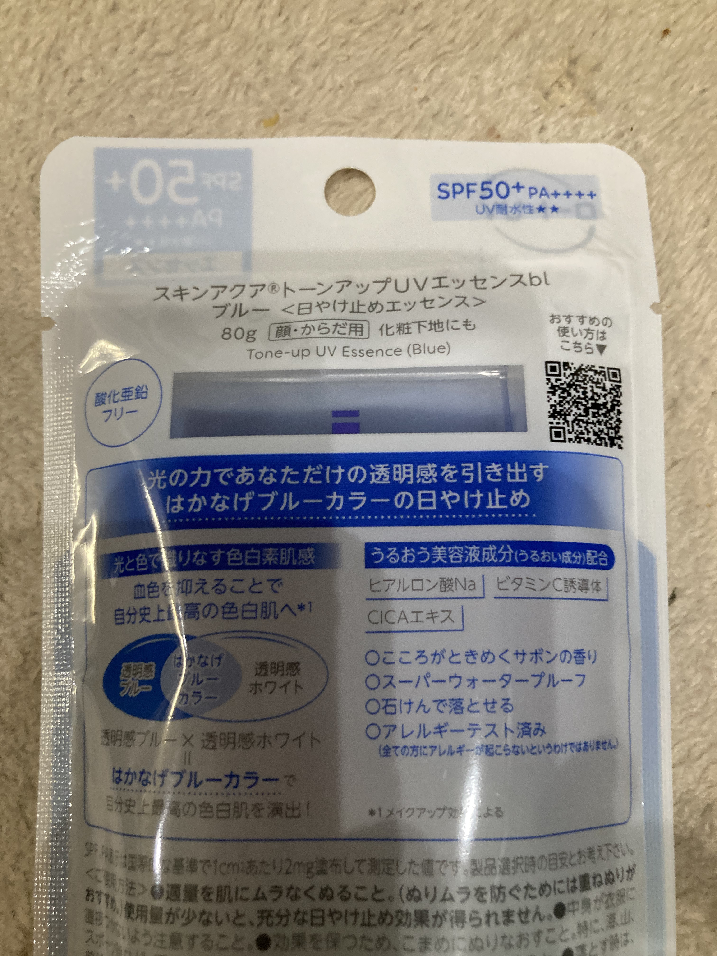 - ※カラー名称「ハピネスオーラ」は「ローズ」へ名称変更となりました。 <ミントグリーン> 赤み補正*1!UVカットしながら、色と光をコントロールし、肌をトーンアップ*1。 ミントグリーンカラーで透き通るような素肌つづく!エッセンスタイプの日焼け止め。 透明感*1のある肌に。 SPF50+、PA++++、UV耐水性★★。 鉱物油フリー。パラベンフリー。ときめくサボンの香り。 <ラベンダー> 明るさ補正*1!UVカットしながら、色と光をコントロールし、肌をトーンアップ*1。 透明感*1を引き出すラベンダーカラーの日焼け止め。 すーっとのびて、みずみずしい使い心地のエッセンスタイプ。 SPF50+、PA++++、UV耐水性★★。 鉱物油フリー。パラベンフリー。ときめくサボンの香り。 <ローズ> 血色感補正*1!UVカットしながら、色と光をコントロールし、肌をトーンアップ*1。 ローズカラーで血色をプラスし、透明感*1のある肌に。 エッセンスタイプの日焼け止め。 SPF50+、PA++++、UV耐水性★★。 パラベンフリー。ハピネスブロッサムの香り。 <ブルー> UVカットしながら、色と光をコントロールし、肌をトーンアップ*1。 血色感を抑えて儚げな色白肌*1に見せるブルーカラーの顔・からだ用日やけ止め。すーっとのびて、みずみずしい使い心地。 透明感ブルー×透明感ホワイト=はかなげブルーカラーで、自分史上最高*2の色白肌*1、うるおう美容液成分(うるおい成分)としてヒアルロン酸Na、ビタミンC誘導体*3配合。 SPF50+/PA++++。こころがときめくサボンの香り。化粧下地にも。石けんで落とせます。 パラベンフリー。鉱物油フリー。アレルギーテスト済み(全ての方にアレルギーが起こらないというわけではありません)。 *1:メイクアップ効果による *2:スキンアクアシリーズにおいて *3:リン酸アスコルビルMg(うるおい成分)