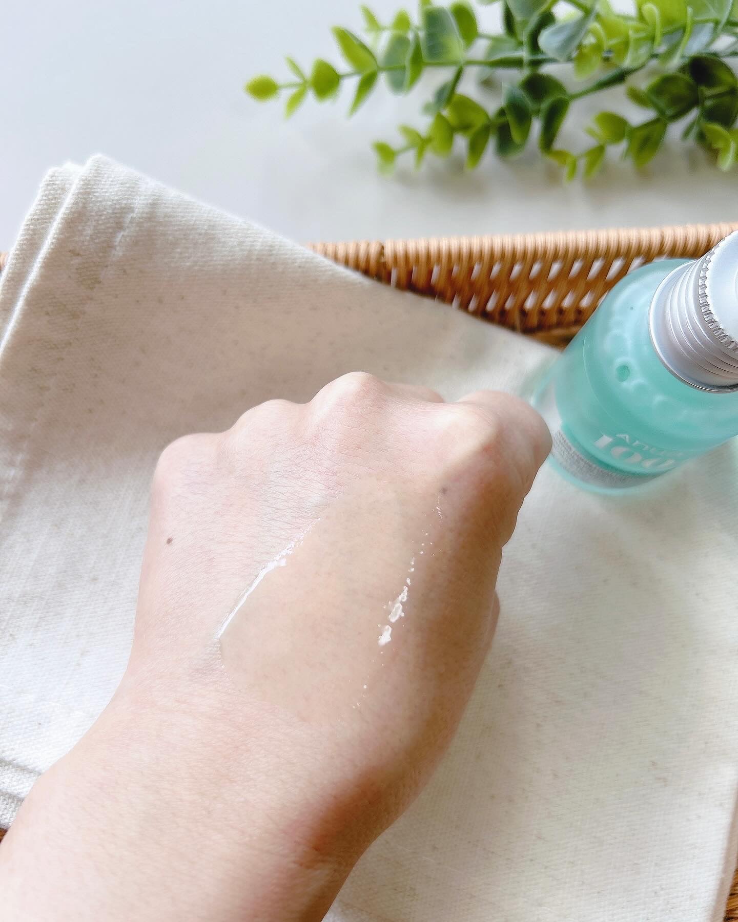 薄い水色でスポイトから出した時はとろみがあったけど塗り伸ばしたらサラサラしてました 美肌再生カプセルの力で 3秒で水光肌に✨️ PDRNはサーモンDNAなので若干匂いは感じました!