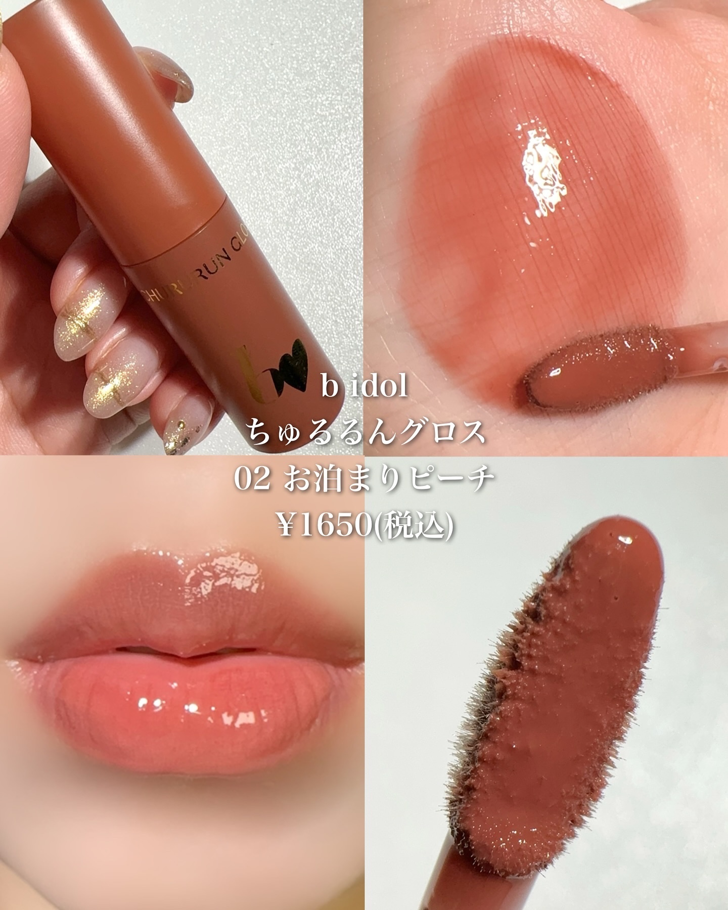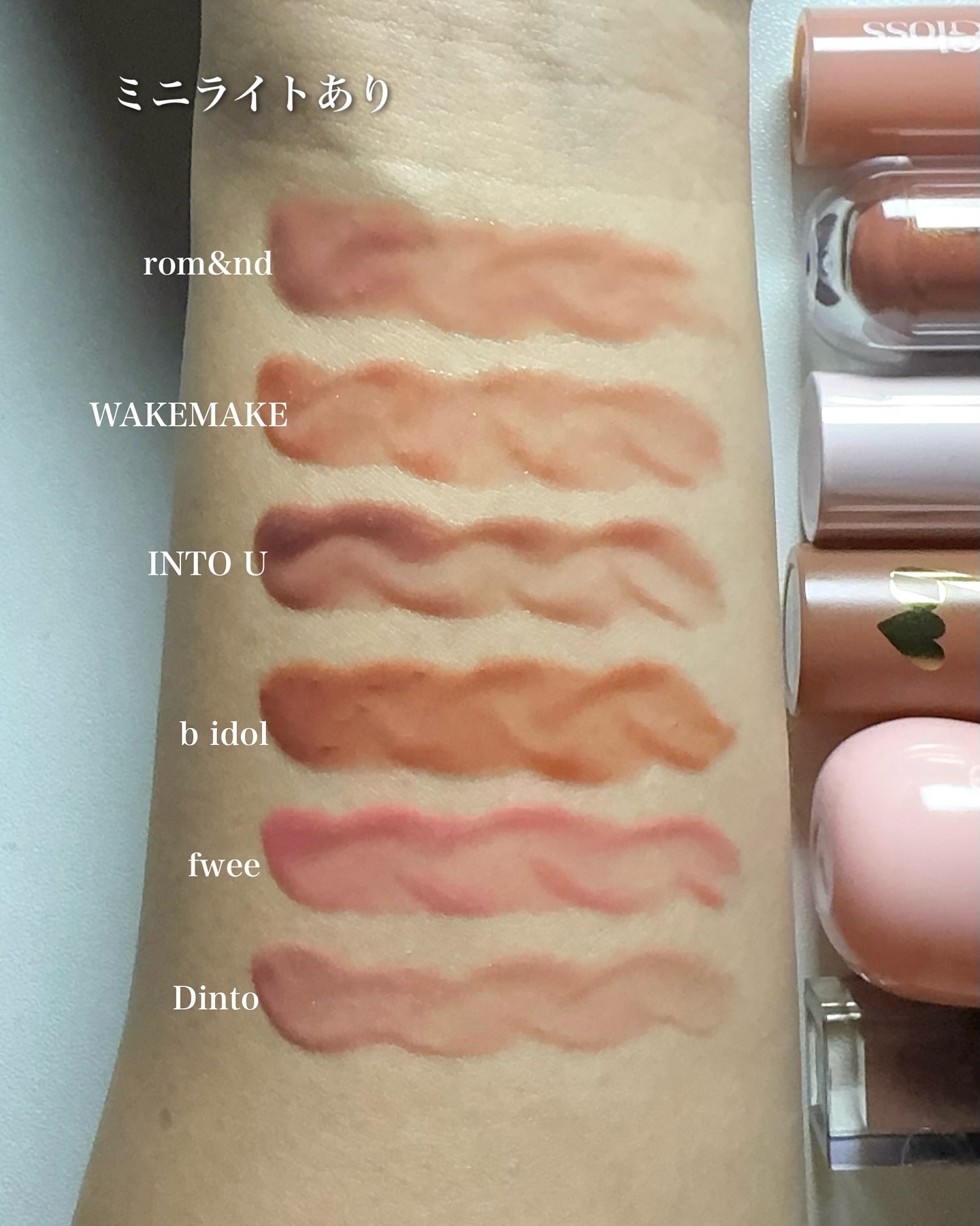ねっちょりボリューム感あるテクスチャーだけど、ベタつきなく使いやすい。 ティントじゃない普通のグロスだから色もちは良くない。 発色ナチュラルだからこれだけでもいいけど、他のリップと合わせても可愛い!!