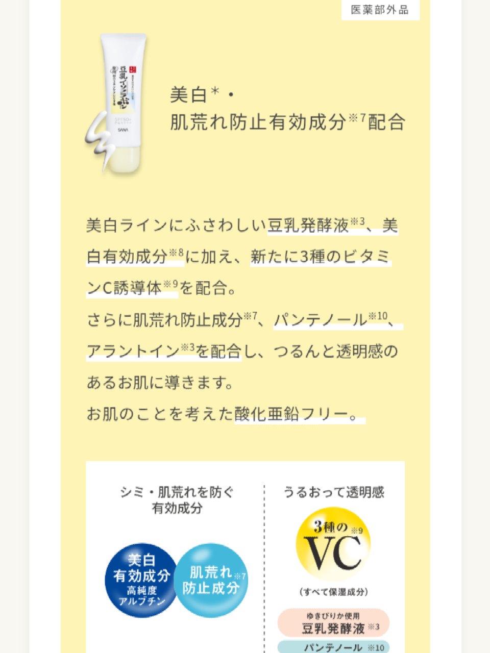 - 【医薬部外品】 豆乳の薬用美白美容液下地 美容液生まれのUV下地で日中も美白*1ケアしながら透明感のあるお肌へ。 ○シミ*1・肌荒れを防ぐ有効成分 美白有効成分高純度アルブチン 肌荒れ防止成分*2 ○うるおって透明感 3種のVC*3 ゆきぴりか使用豆乳発酵液 パンテノール*4 アラントイン(すべて保湿成分) 長時間べたつかず、乾燥・皮脂くずれをW防止 8時間化粧持ちデータ取得済み*5 高密着パウダー*6 皮脂吸着パウダー*7 うるおい持続成分*8 美容液成分*9 82% オールインワン 洗顔後これ1つでOK! SPF50+ PA++++ ブルーライトカット成分*10in *1 メラニンの生成を抑え、シミ・そばかすを防ぐ *2 グリチルレチン酸ステアリル *3 L-アスコルビン酸 2-グルコシド、リン酸L-アスコルビルマグネシウム、3-O-エチルアスコルビン酸 *4 D-パントテニルアルコール *5 当社調べ 仕上がりには個人差があります。(ツヤ・透明感・毛穴目立ちのなさ・薄れのなさ) *6 オキシ塩化ビスマス *7 無水ケイ酸 *8 (エイコサン二酸/テトラデカン二酸)デカグリセリル液(保湿) *9 保湿成分(油性・水性)、水 *10 微粒子酸化チタン ●パッチテスト済み ●アレルギーテスト済み ●ノンコメドジェニックテスト済み (すべての方に皮フ刺激やアレルギーが起きない、また、ニキビのもとができないわけではありません。)